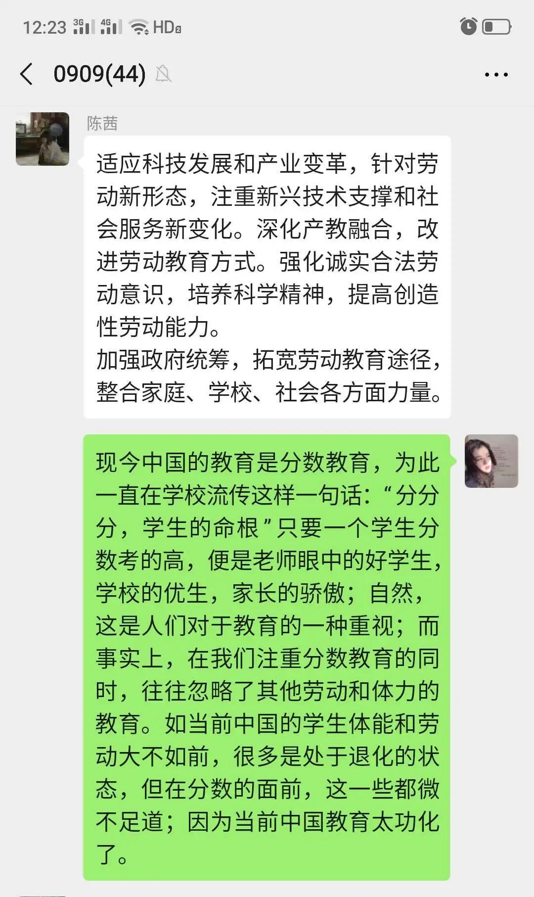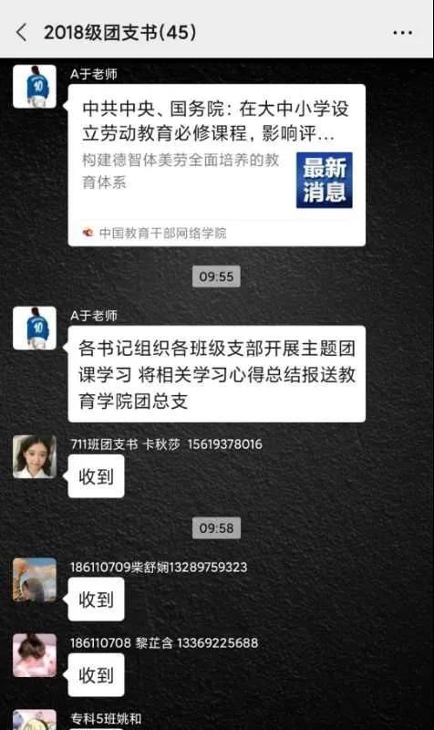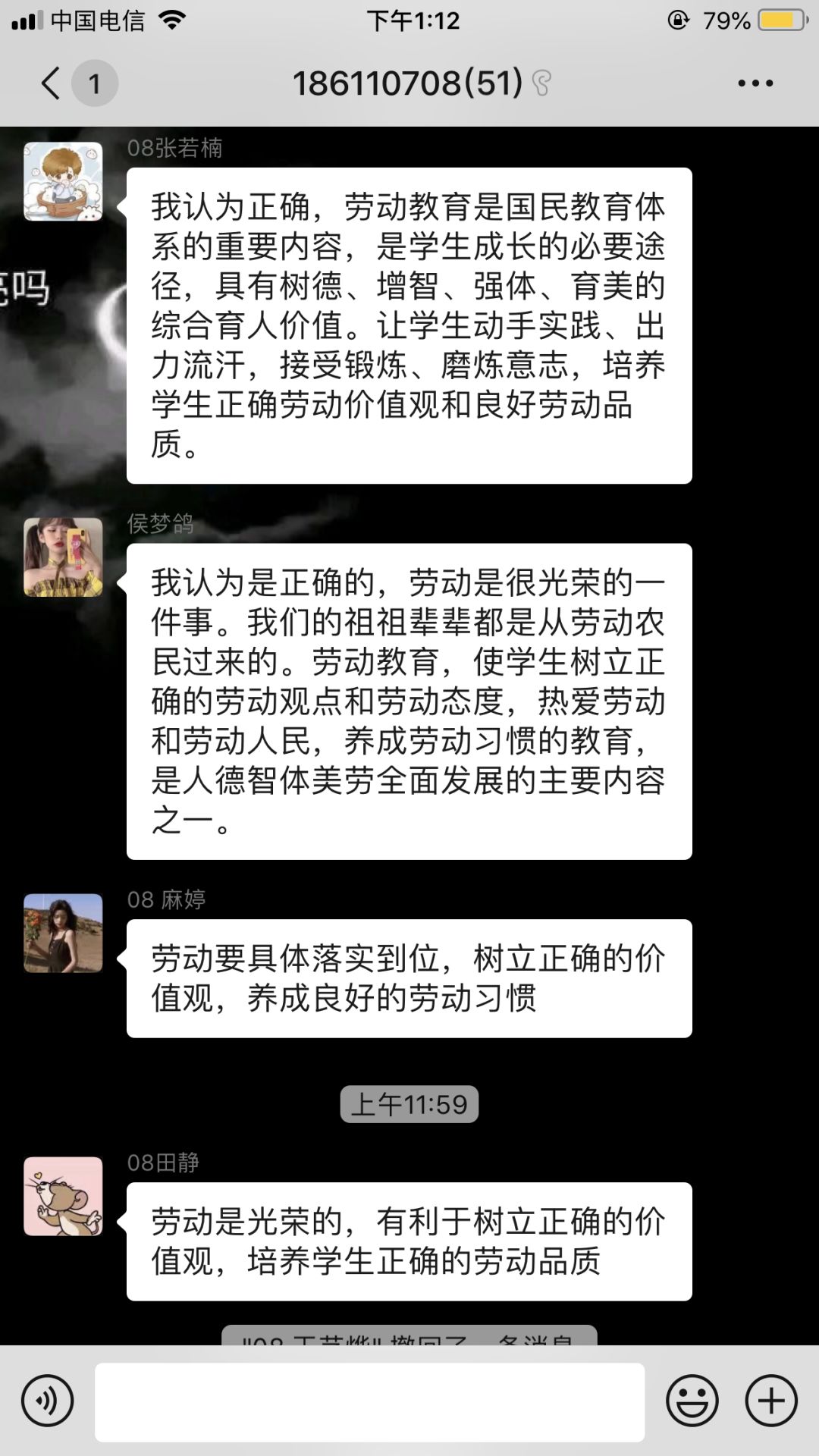在《意见》下发之后,教育学院团总支积极组织各班级团支部开展:“崇尚劳动,尊重劳动,劳动教育我践行”主题团课活动,各班级认真对待,迅速在线上开展了有关劳动教育的学习讨论。这次团课使同学们初步养成认真负责和吃苦耐劳的品质,同时也加强同学们对劳动教育的认知,不断改进劳动教育方法和组织形式,注重激发学生内在需要和动力,提高教育效果。同时这次团课充分调动大学生对于劳动教育的课程的认识,使学生初步养成认真负责、吃苦耐劳的品质和职业意识。同时要注意围绕丰富的职业体验,开展服务性劳动、参加劳动生产,使学生掌握一定的劳动技能,理解劳动创造价值,具有劳动自立意识和能够主动服务他人,促进学生形成正确的世界观、人生观、价值观。