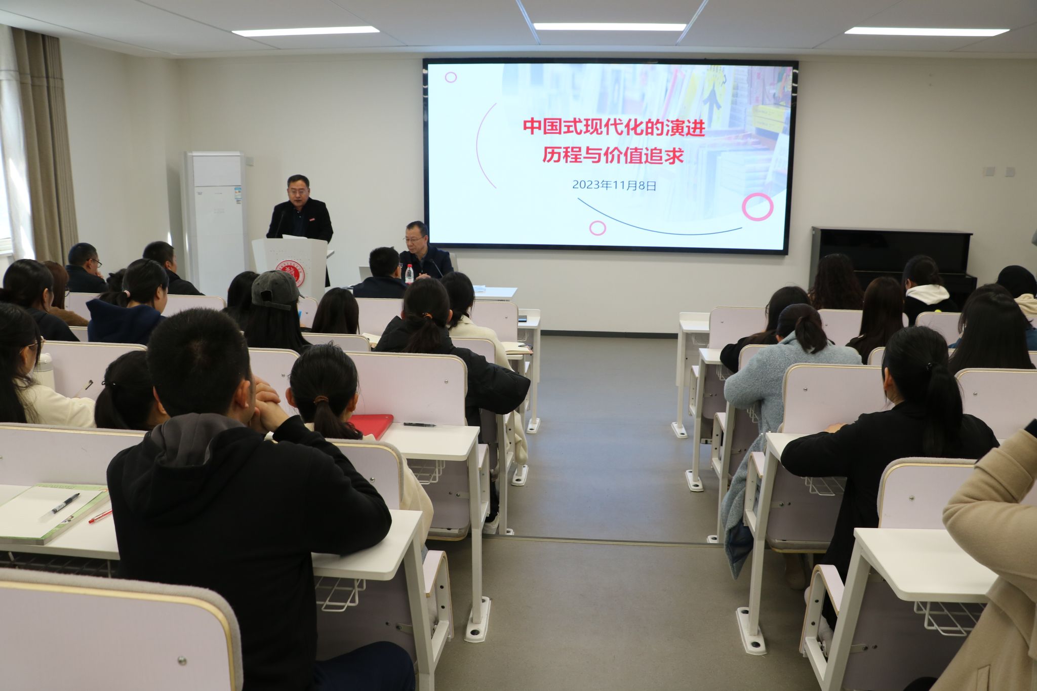 11月8日下午,教育学院与文学与传媒学院联合举办学习贯彻习近平新时代中国特色社会主义思想报告会。马克思主义学院付建成教授应邀作题为《中国式现代化的演进历程与价值追求》专题报告。教育学院、文学与传媒学院师生党员代表参会。会议由教育学院党委书记、副院长王小龙主持。