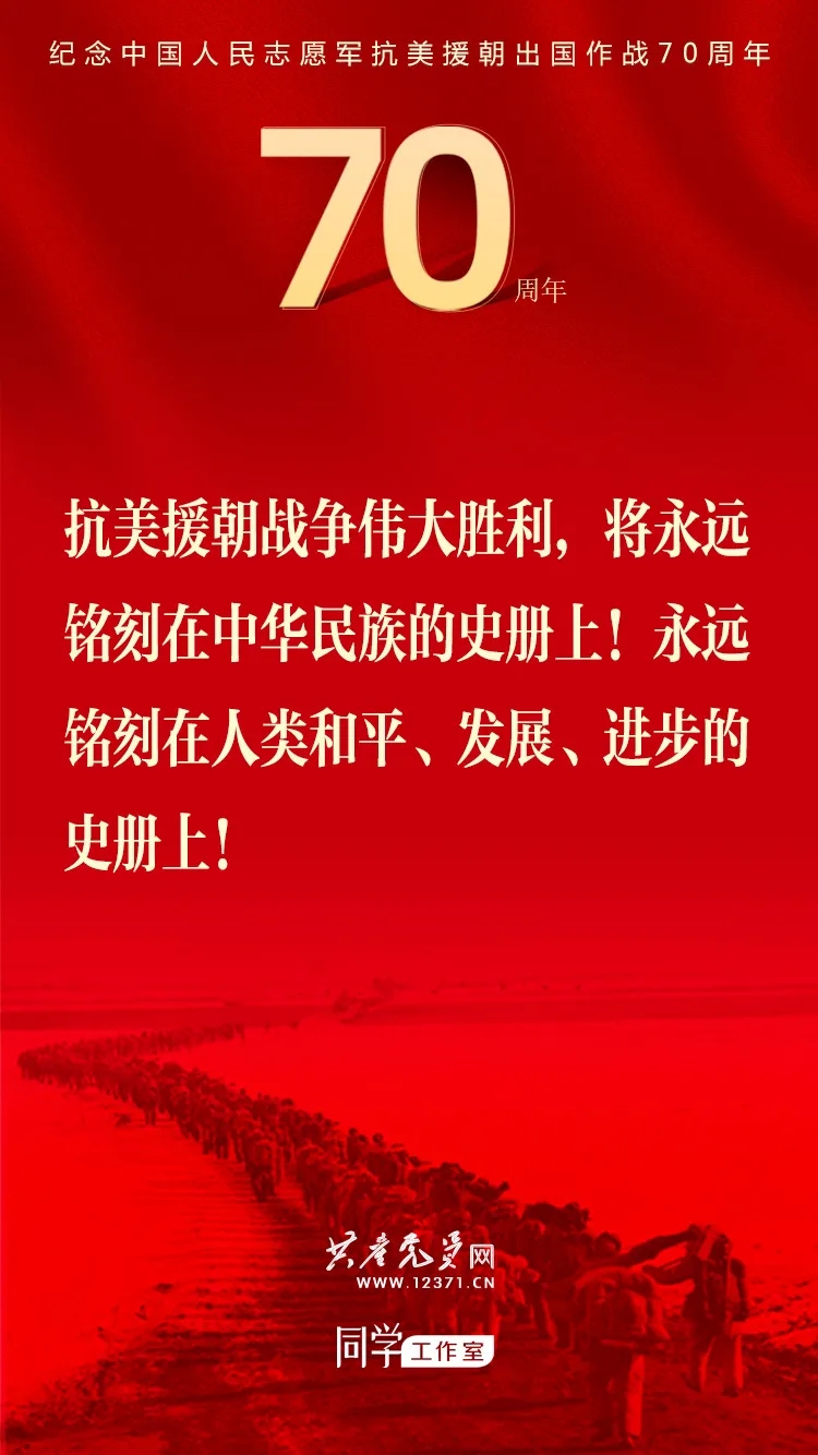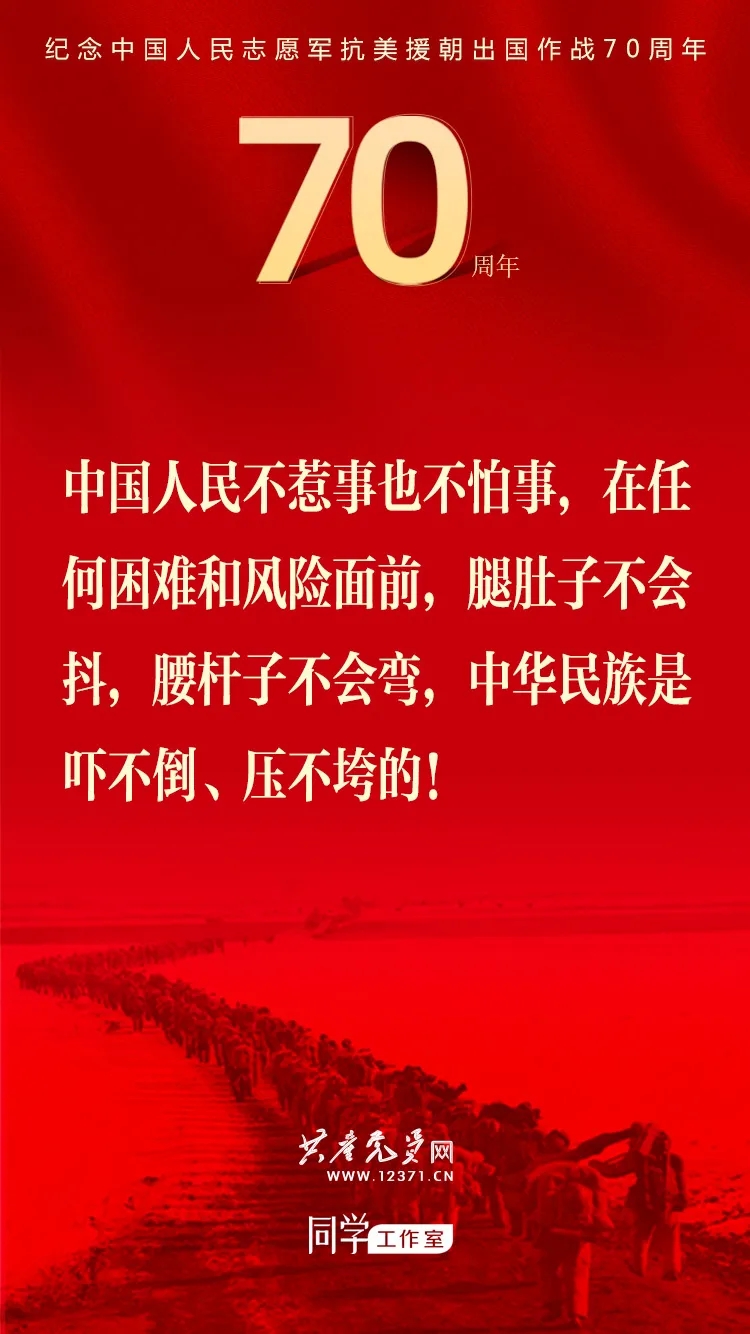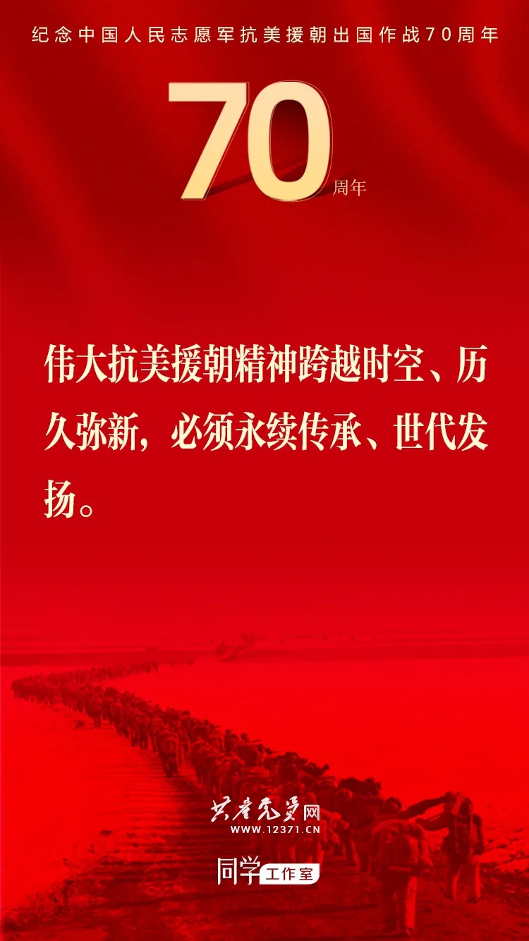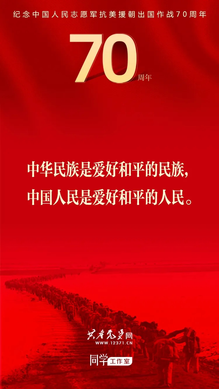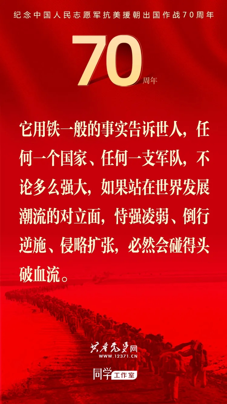 纪念中国人民志愿军抗美援朝出国作战70周年大会于2020年10月23日上午隆重举行,习近平总书记在纪念大会上发表重要讲话。这些讲话金句与你一起感受奋勇前进的力量!