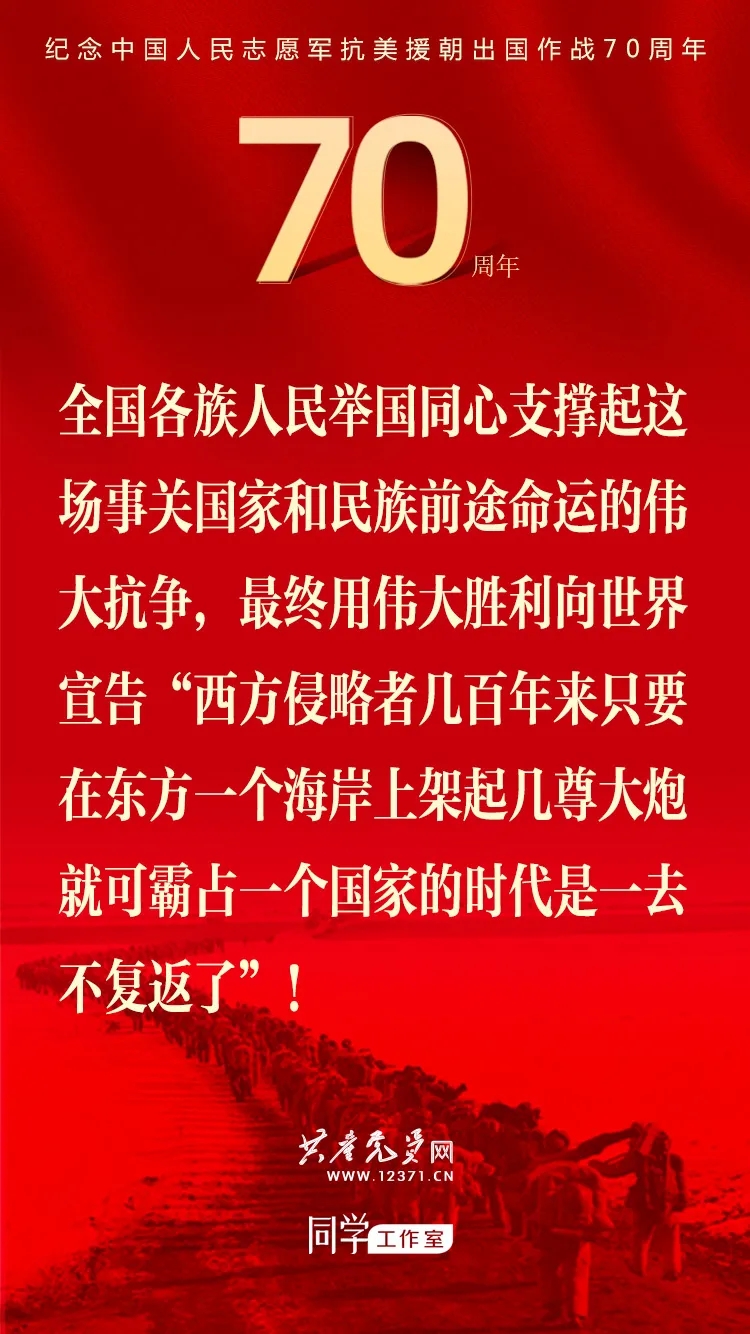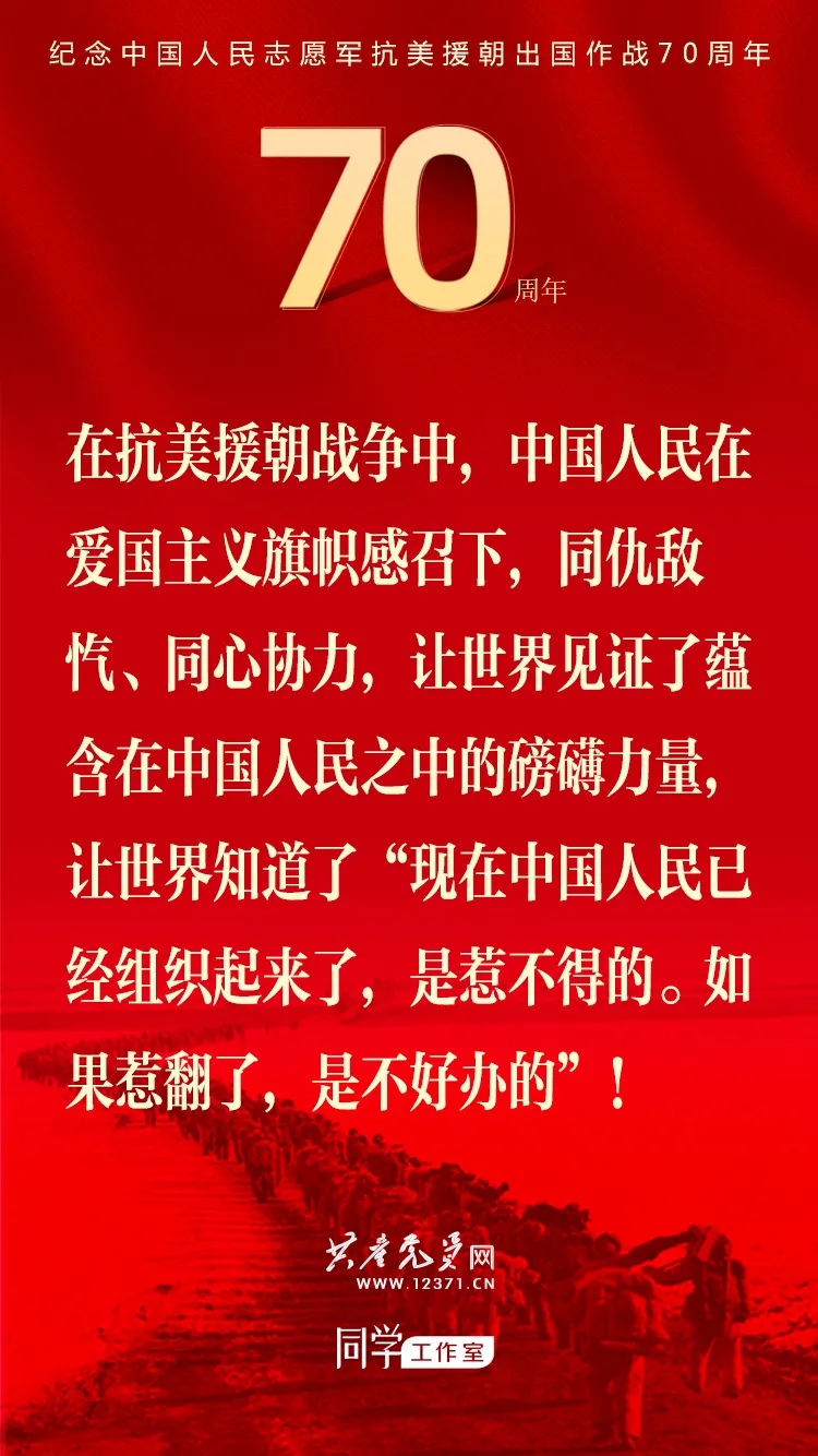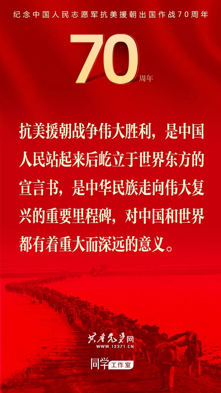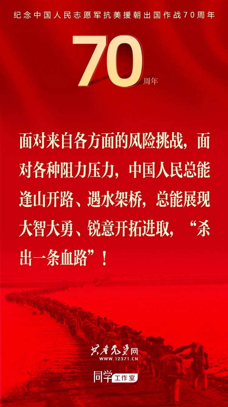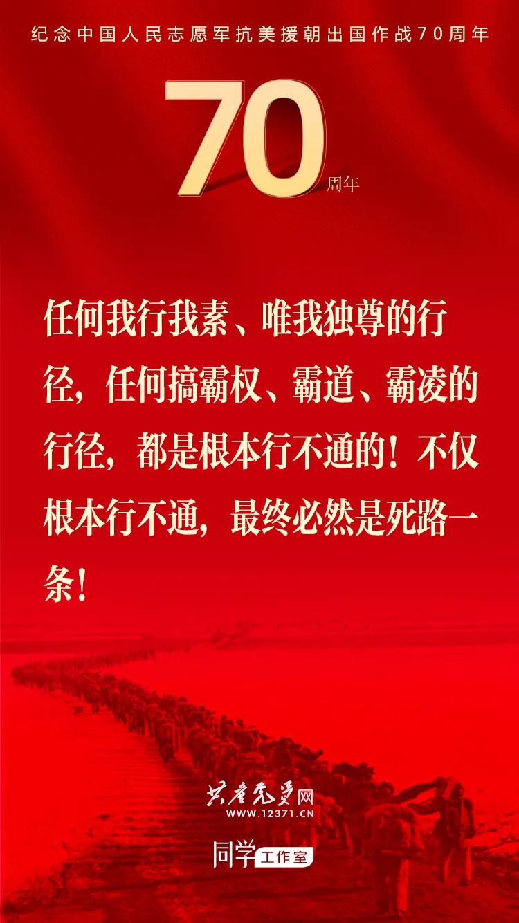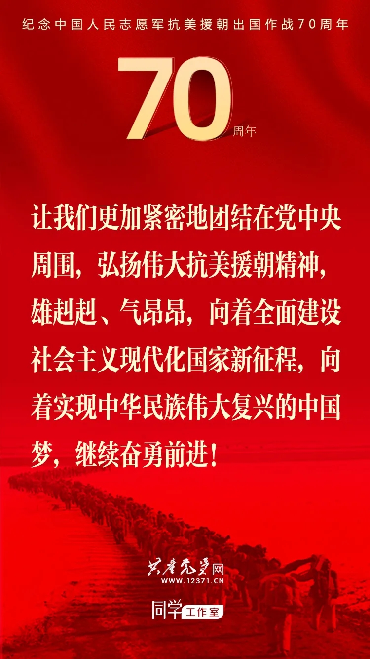 纪念中国人民志愿军抗美援朝出国作战70周年大会于2020年10月23日上午隆重举行,习近平总书记在纪念大会上发表重要讲话。这些讲话金句与你一起感受奋勇前进的力量!