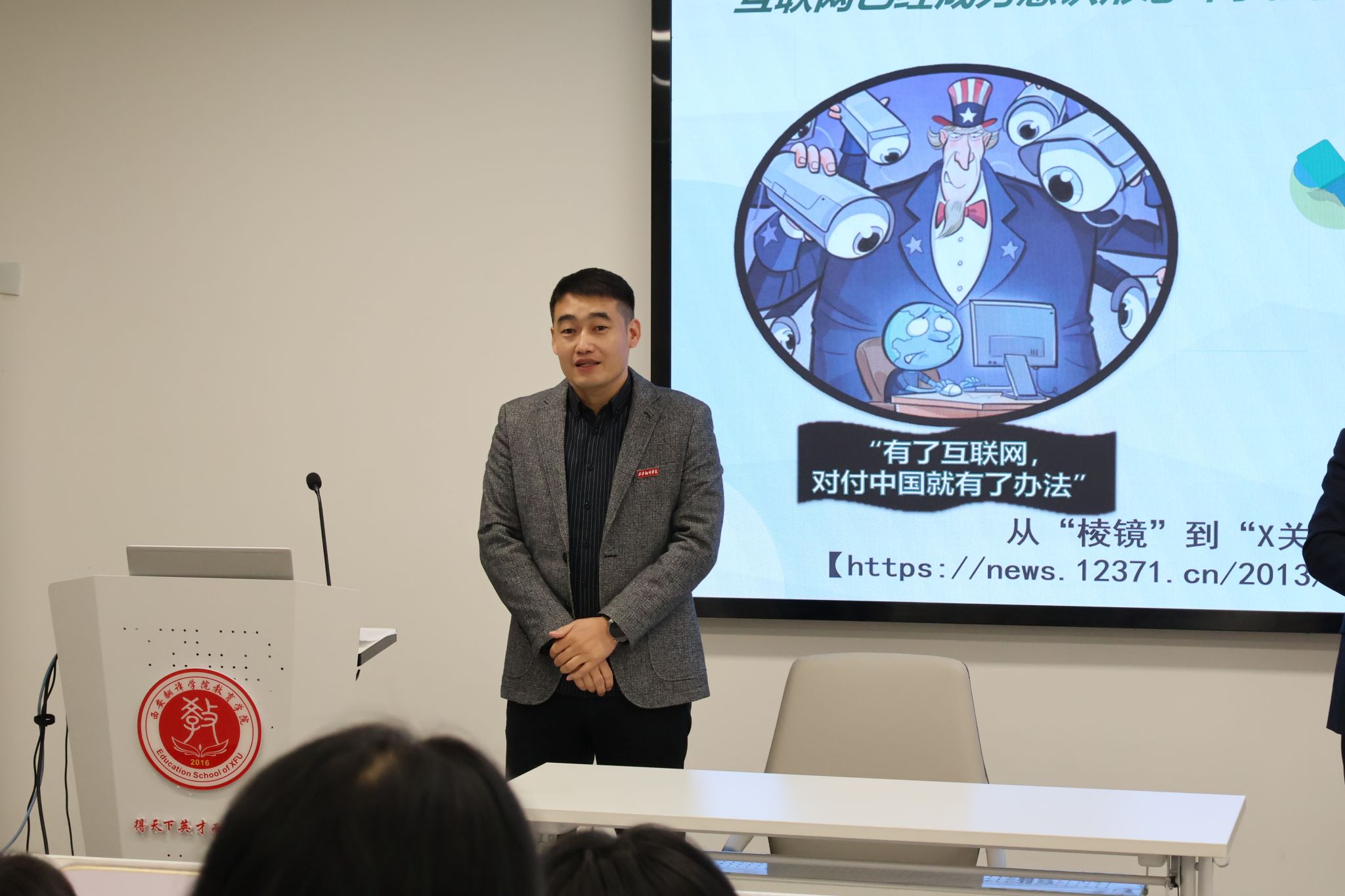 为贯彻落实习近平总书记关于全面加强国家安全教育的重要指示精神,增强全民国家安全意识和法制意识,努力使尊法、学法、守法、用法在全员全校青年当中蔚然成风,切实增强大学生的国家安全意识和素养,西安翻译学院于2024年10月23日星期三在八号楼二楼学术报告厅成功举办了一场以“贯彻总体国家安全观,增强大学生国家安全意识和素养”为主题的教育活动。此次活动由教育学院学生白英英主持,马克思主义学院刘联军老师主讲,在教育学院综合办的大力支持下拉开帷幕。