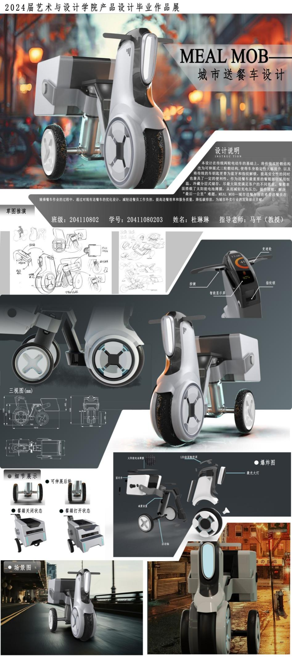 本设计在传统两轮电动车的基础上,将传统双轮毂结构改为可伸展式三轮毂结构,使得车身稳定性大幅提升.以及将传统的车钥匙更替为蓝牙和指纹解锁,提高安全性的同时也兼具了一定的便利性。作为送餐车最重要的餐箱部位采用恒温、冷藏分层式储存,尽最大限度满足客户的不同需求。餐箱表面搭载了太阳能电池薄膜,从而减轻充电压力,提升续航,解决“最后一公里”难题。MEAL MOB—城市送餐车旨在希望送餐员在骑乘餐车作业的过程中,通过对现有送餐车的优化设计,减轻送餐员工作负担,提高送餐效率和服务质量,降低碳排放,为城市外卖行业的发展作出贡献。
