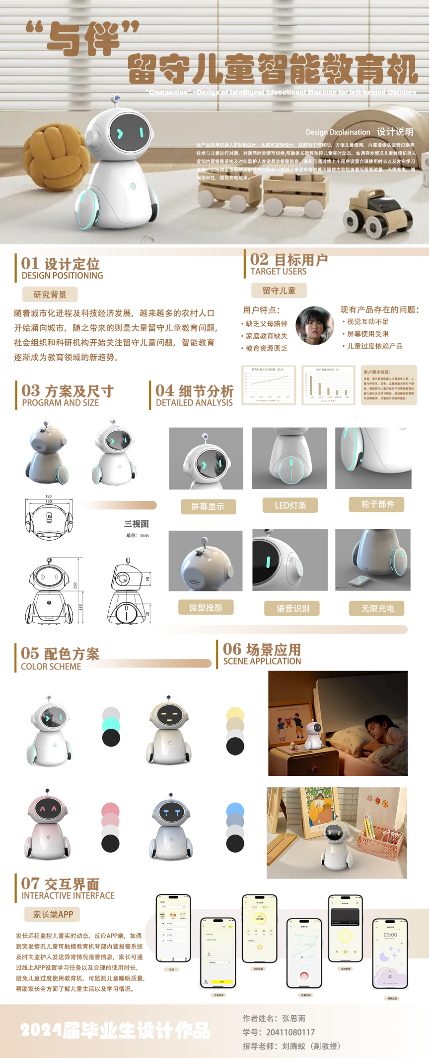 针对留守儿童教育问题以及情感陪伴问题进行产品设计,为留守儿童提供均衡教育资源以及更加丰富的知识,进行高效学习弥补情感陪伴以及教育方面的缺失,帮助他们更好的成长,促进留守儿童全面展。通过机器人IP形象设计,独特的造型、色彩、圆润的线条,符合儿童审美,外观可爱、友善具有亲和力;头部可旋转设计,底部轮子可移动方便儿童使用;微型投影按压设计弹出投影可根据儿童需求将屏幕所展现内容投屏置所需要位置;结合游戏等趣味化学习理念,根据儿童自身情况定制个性化学习计划;内置摄像头、语音识别等技术与儿童进行对话,对话同时表情可根据儿童状态进行变化,帮助儿童缓解孤独感;顶部摄像头,家长远程监控儿童实时动态,如遇到突发情况儿童可触摸教育机背部内置报警系统及时向监护人发送异常情况报警信息;家长可通过线上小程序设置合理的使用时长,避免儿童过度使用教育机;无线充电,增强便利性,提高充电效率。此设计使留守儿童可以更好面对生活中困难和挑战通过智能教育技术的应用,打破地域和经济条件的限制,让更多留守儿童享受优质教育资源,提升社会教育水平。
