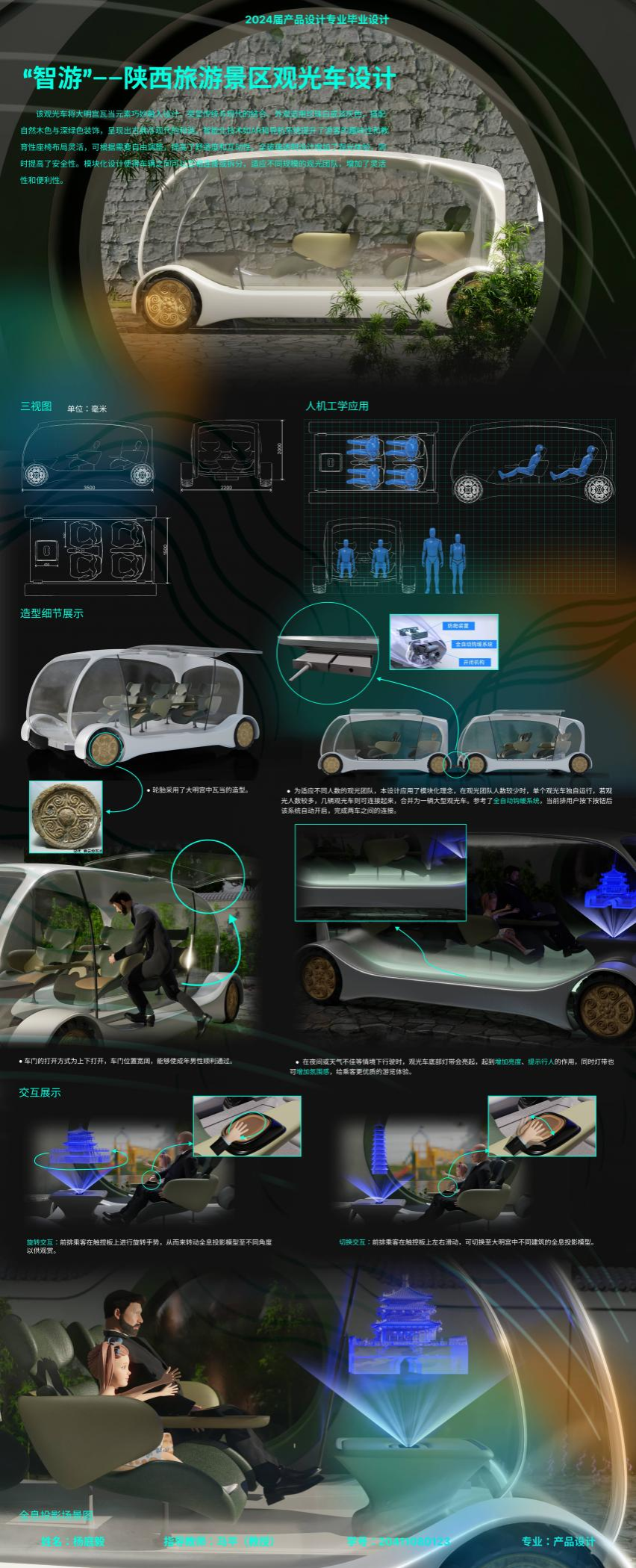 该观光车将大明宫瓦当元素巧妙融入设计,突显传统与现代结合的设计理念。外观选用珍珠白或淡灰色,搭配自然木色与深绿色色彩的内饰搭配,呈现出智能与自然的和谐统一。智能化技术如AR和导航系统提升了游客的趣味性和教育性。座椅布局灵活,可根据需要自由调整,提高了舒适度和互动性。全玻璃透明设计提高了游客旅游体验,同时提高了安全性。模块化设计使得车辆之间可以些相连接或拆分,适应不同规模的观光团队,增加了灵活性和便利性。