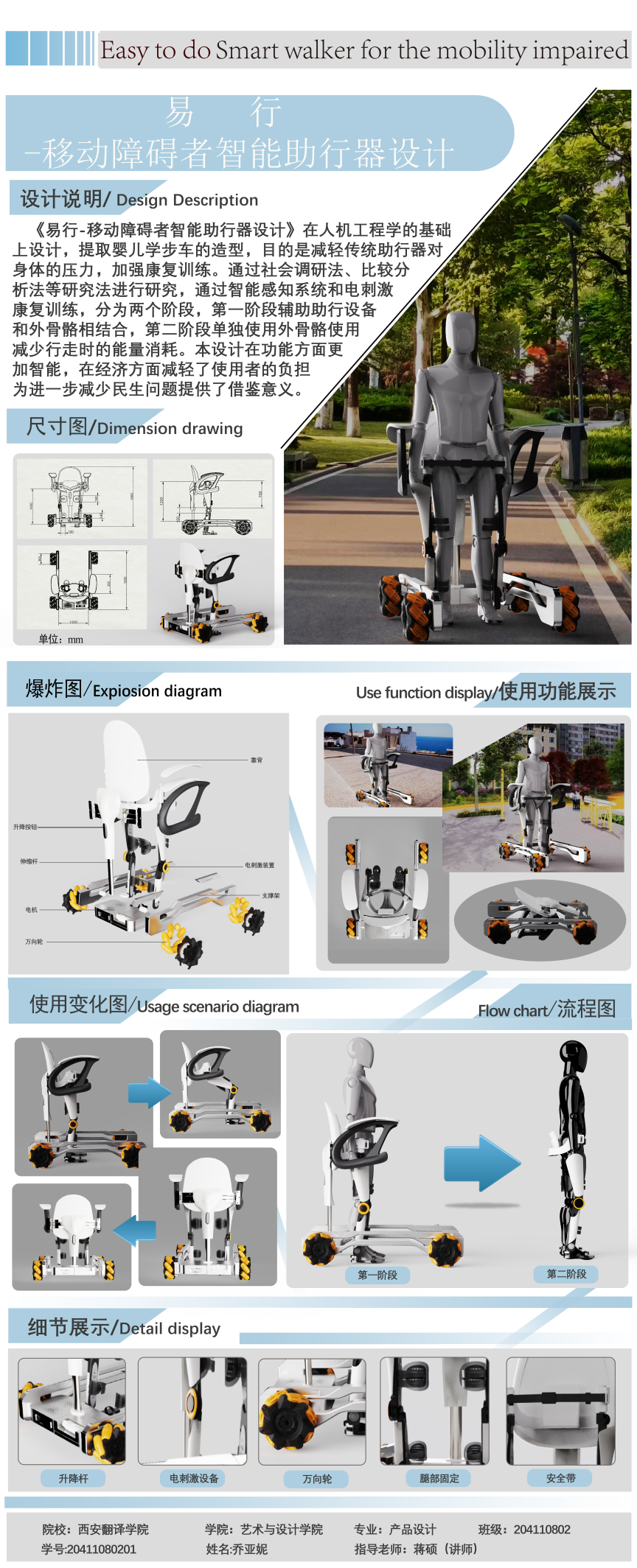 《易行-移动障碍者智能助行器设计》在人机工程学的基础上设计,提取婴儿学步车的造型,目的是减轻传统助行器对身体的压力,加强康复训练。通过社会调研法、比较分析法等研究法进行研究,通过智能感知系统和电刺激康复训练,分为两个阶段,第一阶段辅助助行设备和外骨骼相结合,第二阶段单独使用外骨骼使用减少行走时的能量消耗。本设计在功能方面更加智能,在经济方面减轻了使用者的负担为进一步减少民生问题提供了借鉴意义。