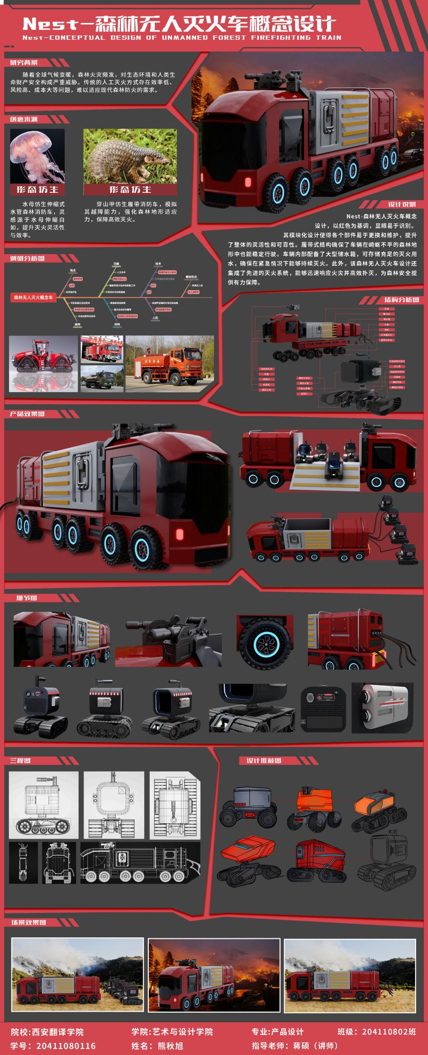 因此,森林无人灭火车的概念设计,旨在通过自动化、智能化的技术手段,提高森林火灾的预防和应对能力。该森林无人灭火车采用先进的无人驾驶技术,能够在复杂多变的森林环境中自主导航、定位、避障,实现全天候、全地形的灭火作业。车辆配备了高效灭火系统,包括水枪、干粉灭火器等,能够根据火势情况自动选择合适的灭火方式。同时,车辆还搭载了多种传感器和监测设备,能够实时监测火场温度、湿度、风向等关键参数,为灭火决策提供科学依据。森林无人灭火车概念设计,不仅提高了森林火灾的应对速度和效率,降低了灭火人员的安全风险,还有助于保护生态环境和森林资源,具有重要的实际应用价值和推广前景。