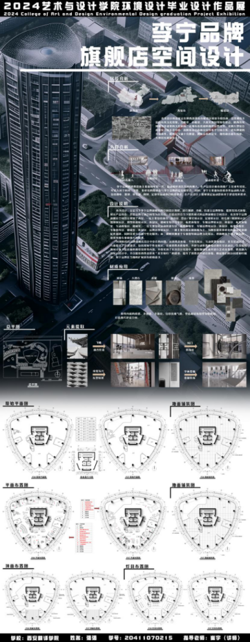 本次设计,立足当下李宁品牌旗舰店的空间设计现状,进行调研、分析,以建立品牌形象、提供沉浸式体验、展示产品特色、营造品牌互动空间等为出发点,打造出符合当下销售模式的品牌旗舰店空间设计。本次李宁品牌旗舰店空间设计规划了两层,一层主要包括前台、接待区、登山 / 攀岩展示区、足球展示区、羽毛球 / 网球展示区、篮球展示区、滑雪装备展示区、休息区、储藏室知识分享区、私密体验室、专属品牌展示区、休息区、私密体验室、互动体验区、储藏室。二层主要包括运动装备专区、私密体验室、专属品牌展示区、休息区、私密体验室、专业指导区、储藏室、休息区、品牌故事展示区。第一层主要以展示和体验为主,为顾客提供多样化的运动装备和配件选择,同时注重互动和个性化服务;第二层则更侧重于专业指导和品牌文化展示,帮助顾客全面了解品牌,提供更加专业和深入的服务。