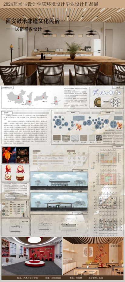 西安鼓乐非遗文化民宿,在设计中保持传统韵味的同时融入现代设计理念,打造一处集住宿、休闲、文化体验于一体的非遗文化民宿空间,民宿以宋代建筑为原型,结合现代建筑理念,营造出一种古朴典雅的氛围,室内空间划分为多个功能区,包括住宿区、休闲区、文化展示区等,各区域之间即相互独立又相互贯通,方便游客自由穿梭。整体色调以暖色系为主,运用木色、砖红等色彩,营造出温馨舒适的氛围,在空间设计中巧妙融入西安鼓乐元素,如在墙面绘制鼓乐团,将传统乐器作为装饰摆件,让游客在空间中感受到西安鼓乐的独特韵律。