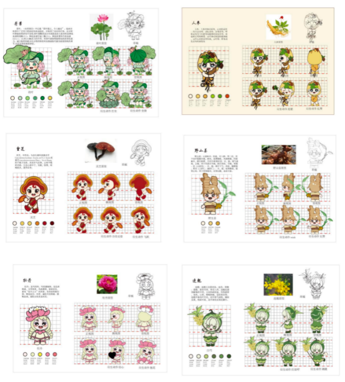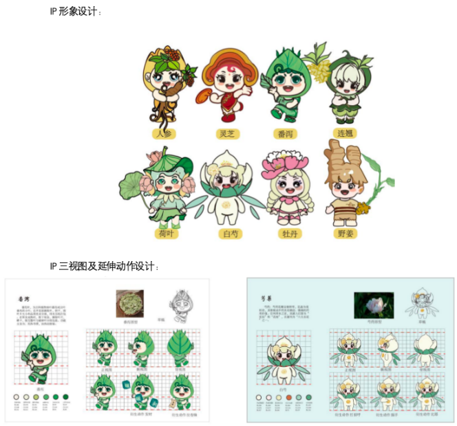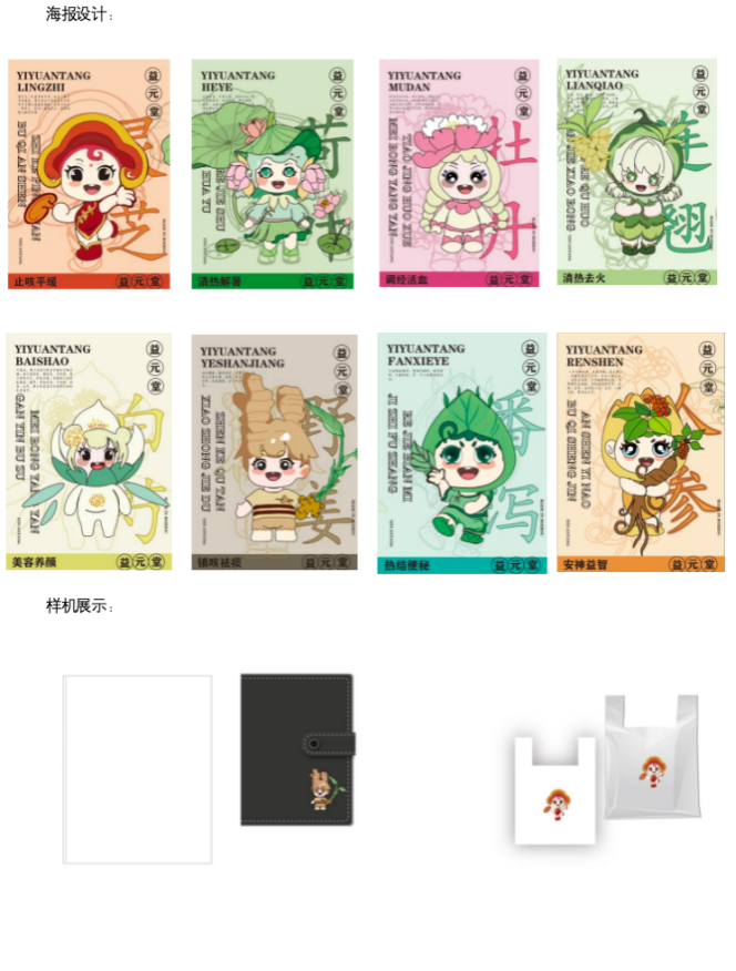 “益元堂”结合企业文化提取具有特征中草药药材的形象进行IP形象设计。 运用中药材元素,将元素和设计相结合,完成IP形象设计。 设计运用了八种中草药的形象,采用Q版的IP形象设计风格,Q版的造型会 更加可爱,让人共情,而且符合任何群体。IP形象主要以人参、灵芝、番泻 叶、连翘、荷叶、白芍、牡丹、野生姜这八味中药材为设计对象,在塑造时, 运用药材本身的形象特征进行设计,把药材拟人化,展现不同药材的特点和形 象,让形象更具体。 加上现在针对于中医药文化东西内容都是比较枯燥和乏味的,用人们更喜欢 的IP形象反而会更有趣,更吸引人的兴趣,更符合当代人群的喜爱。IP 形象还 具有较强的延展性,可以做成动态的,也可以是静态的,打破死板的呈现方 式,给受众带来不同的视觉效果。 使得每一味草药都有自己的特征,以强烈的视觉感来创作IP形象。以达到传 扬和推广中国医药传统文化的作用。