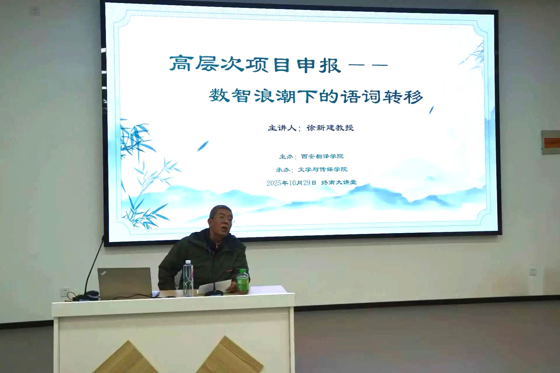 10月29日下午,文学与传媒学院于终南大讲堂举办学术讲座,由兰拉成院长主持。本次讲座特邀中国比较文学学会文学人类学研究分会荣誉理事长、人类学高级论坛学术委员会主席团主席、中国艺术人类学学会学术委员会委员徐新建教授主讲,主题为“高层次项目申报——数字浪潮下的语词转移”。来自陕西师范大学文学院、西安石油大学、西安外国语大学等高校的多位教授及学科带头人应邀出席,我院师生代表共同聆听讲座。