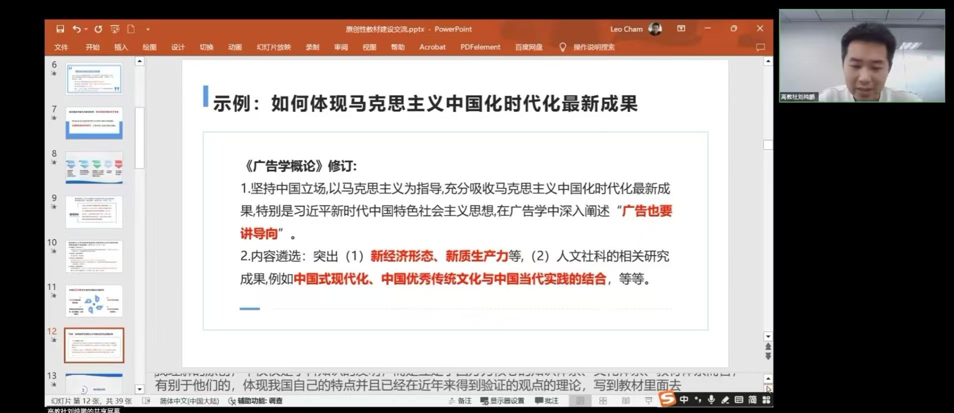 在核心内容分享中,刘老师重点强调了文科教材的思想导向问题。他明确提出,汉语言文学类教材作为传承文化、塑造价值观的重要载体,其指导思想必须牢牢立足马克思主义立场、观点、方法,严格遵循相关政策要求,确保教材内容的政治正确性与思想引领性。他结合近年来教材审核中的典型案例,阐释了如何在文科不同课程的教材内容中,潜移默化融入马克思主义文艺观,实现知识传授与价值引领的有机统一。