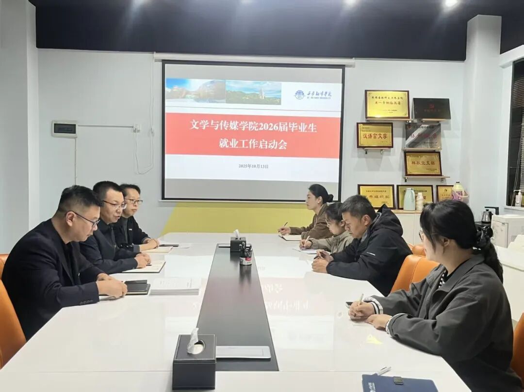 为扎实推进2026届毕业生就业工作,全面提升就业质量,10月13日,文学与传媒学院在8号教学楼综合会议室精心组织召开了2026届毕业生就业工作启动会。学院党委书记、副院长李绍先,综合办公室副主任胡松武,大学生就业创业指导服务中心郭嘉老师,以及毕业班全体辅导员齐聚一堂,共同为毕业生就业工作出谋划策。