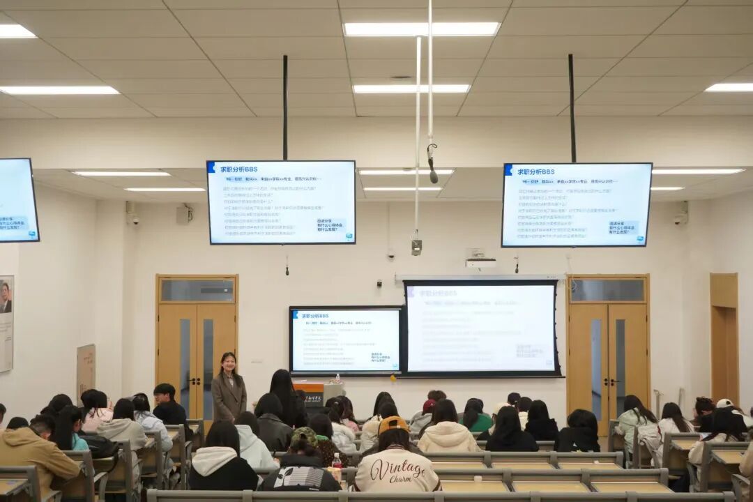 互动交流环节,王佳以“外部环境中有利或不利求职的因素”为议题,激发同学们的讨论热情。大家围绕新媒体机遇、就业竞争挑战、政策扶持领域等内容各抒己见,思维碰撞出火花,现场气氛高涨。