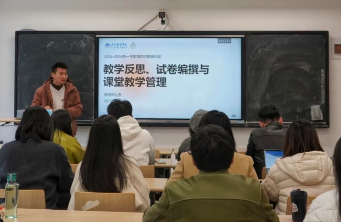 为进一步夯实教学质量,优化教学管理,10月22日中午,视觉传达系组织在1216教室开展第四次教研活动。视觉传达系教师围绕“教学反思、试卷编撰与课堂教学管理”三大核心议题展开深入研讨,由教研室主任窦英杰主讲,视觉传达系教师积极参与。