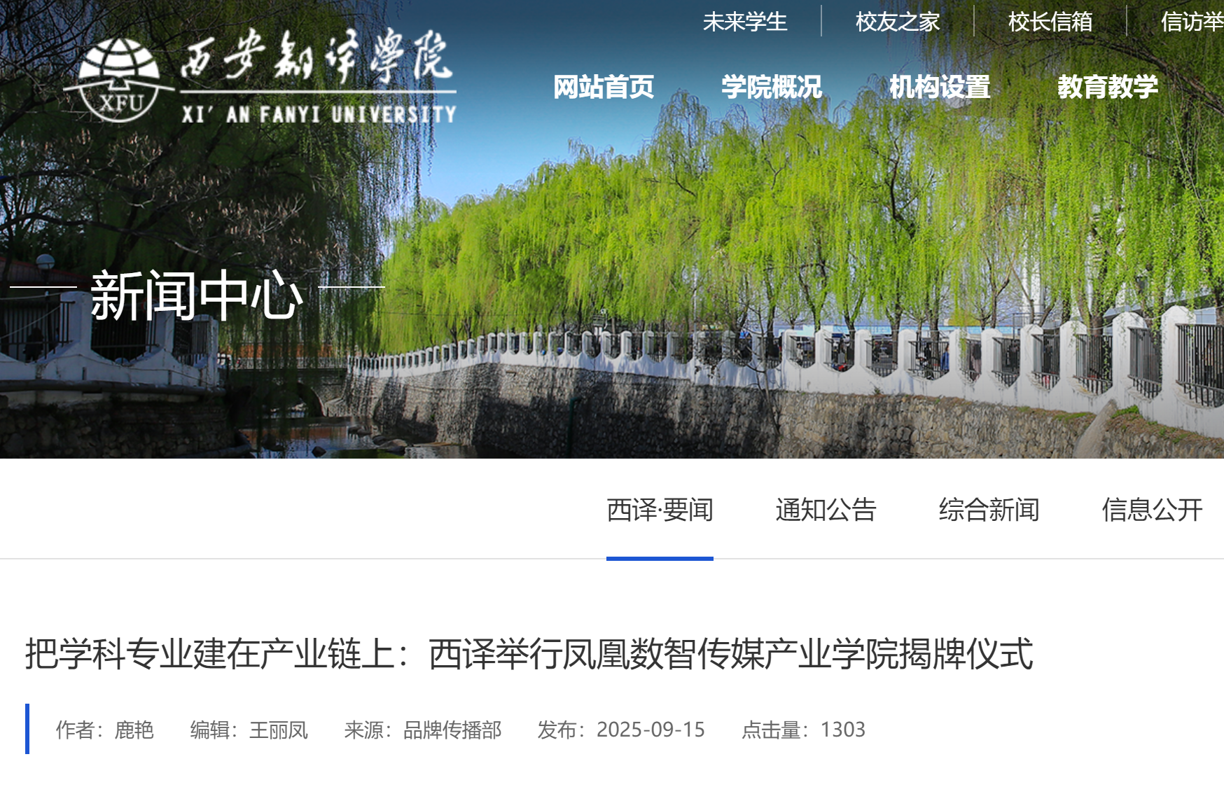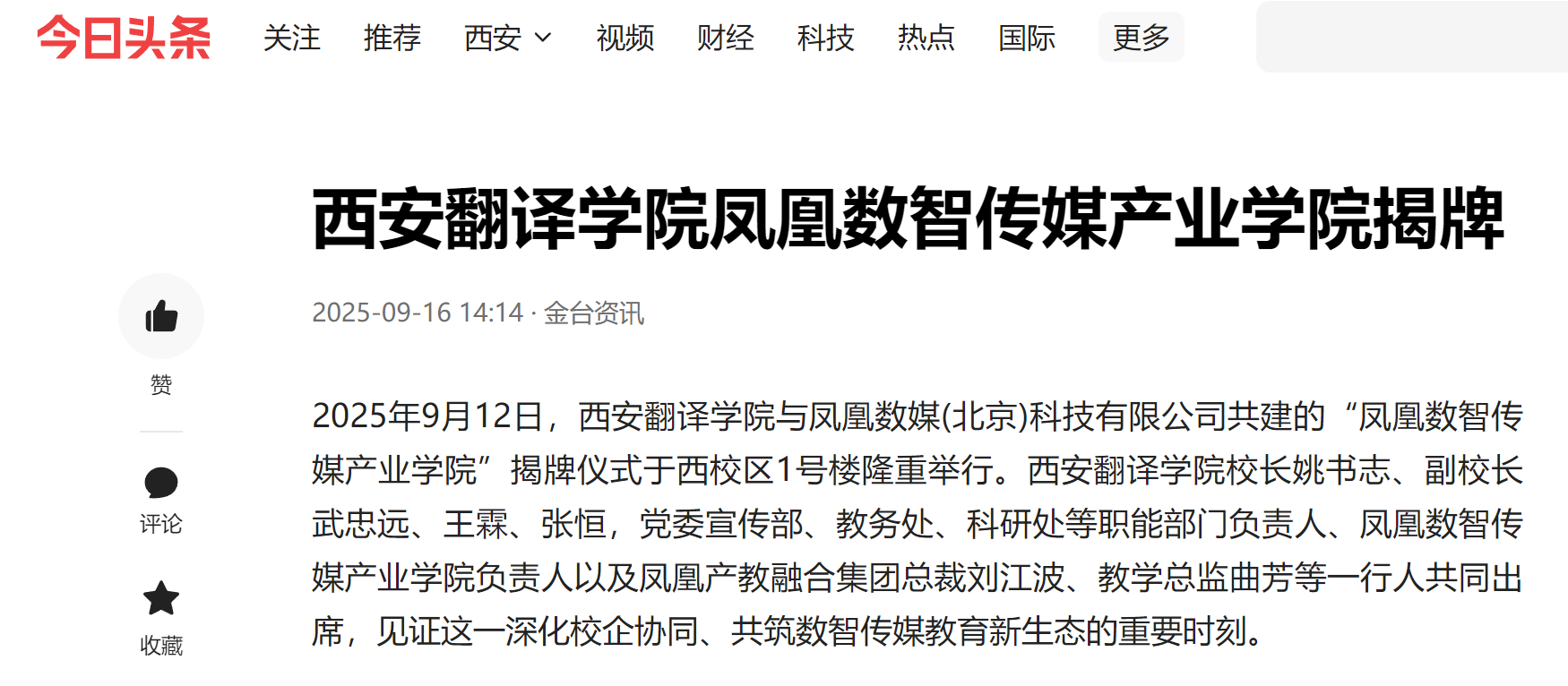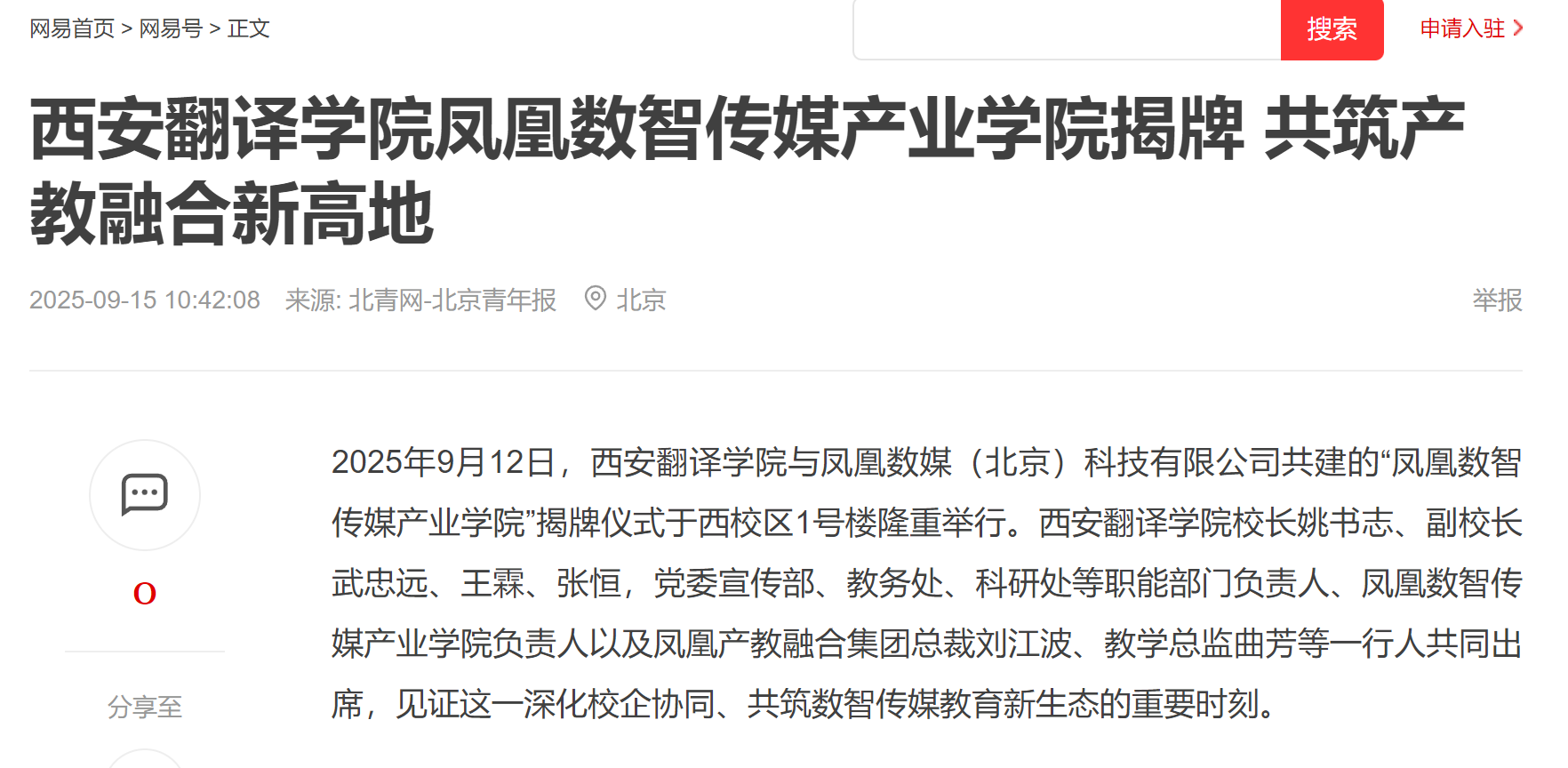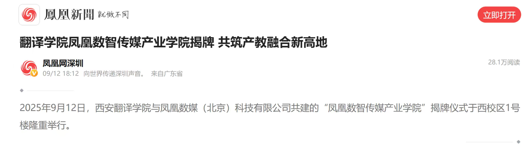 2025年9月12日,西安翻译学院与凤凰数媒(北京)科技有限公司共建的“凤凰数智传媒产业学院”,在西安翻译学院西校区1号楼举行揭牌仪式。据悉,凤凰数智传媒产业学院揭牌获人网、凤凰网、教育新闻等多家媒体平台持续关注报道,校企协同育人的创新实践引发行业关注。