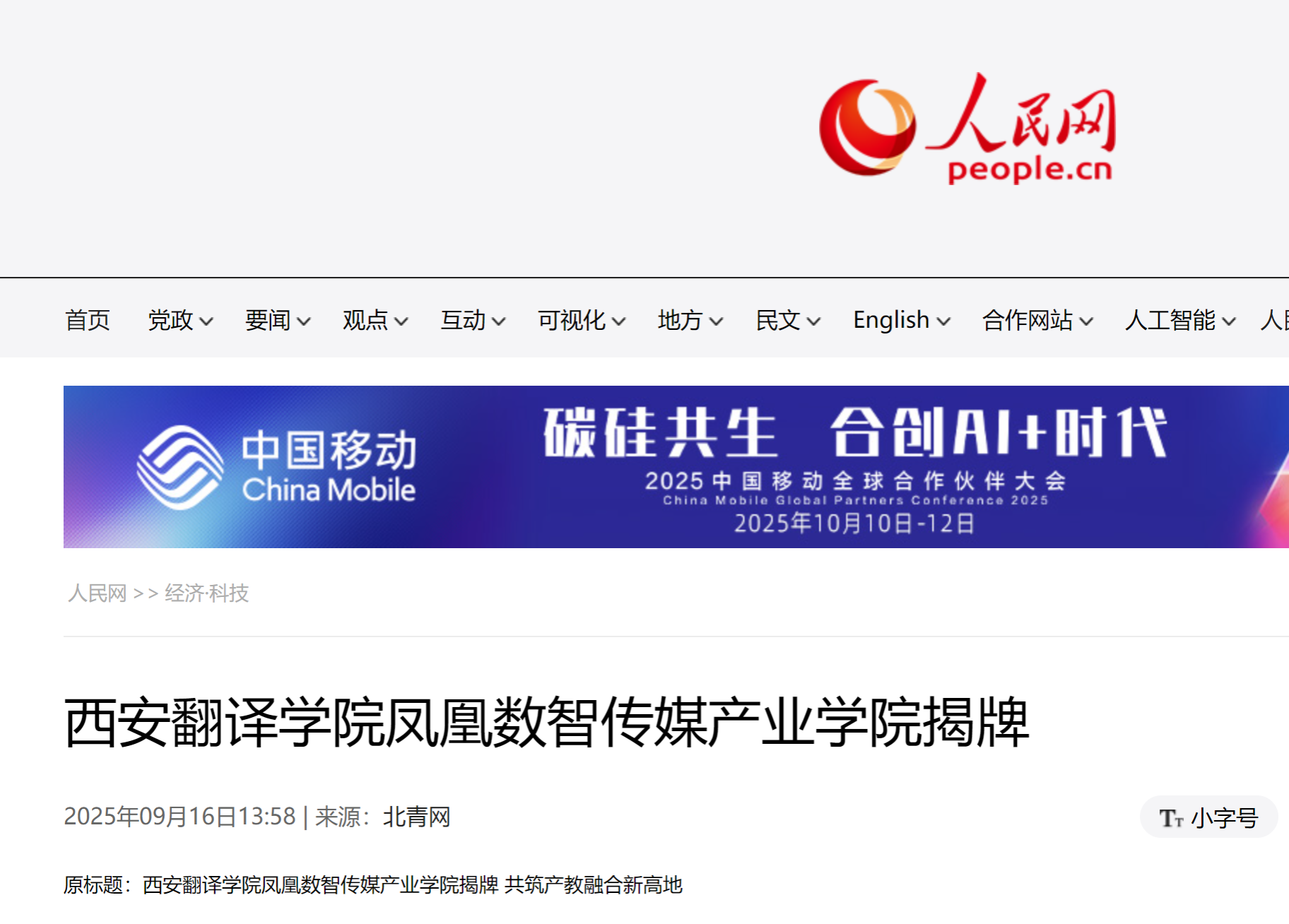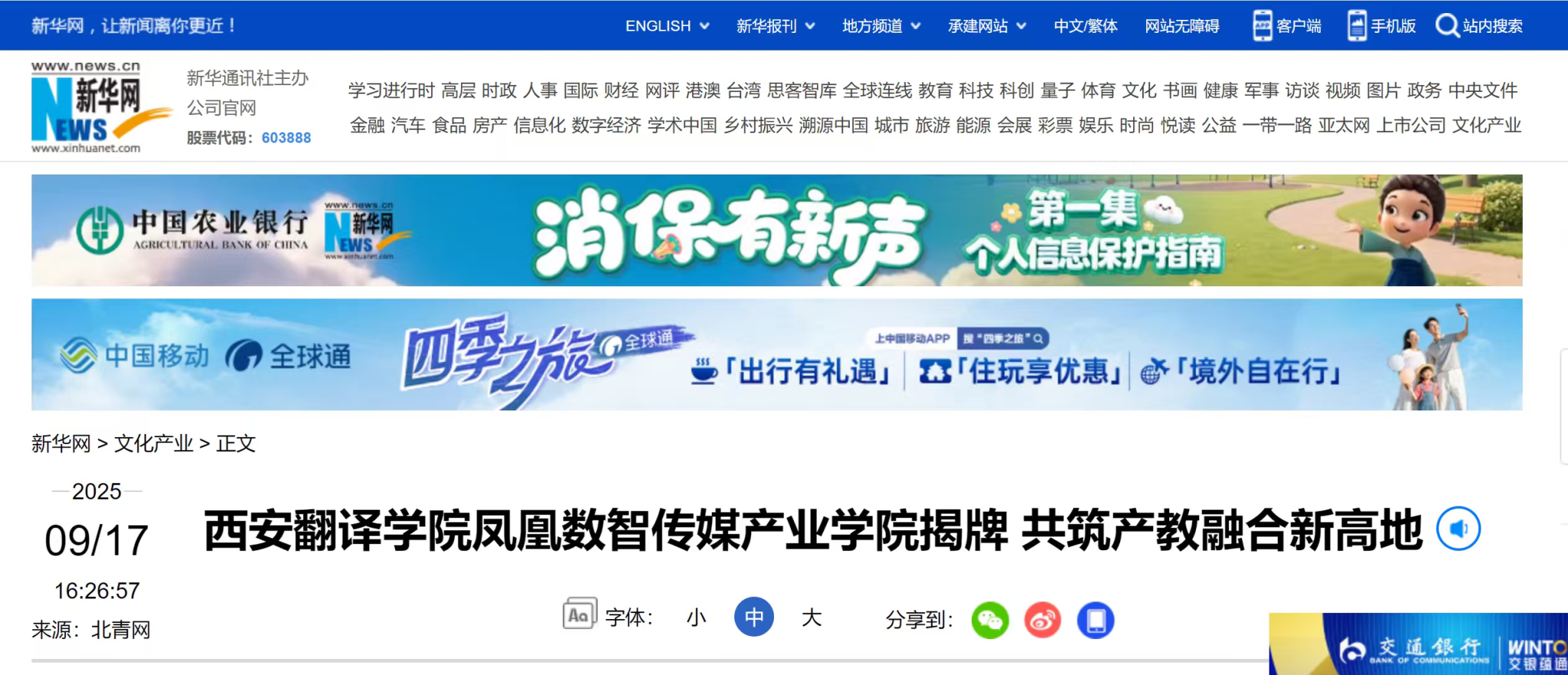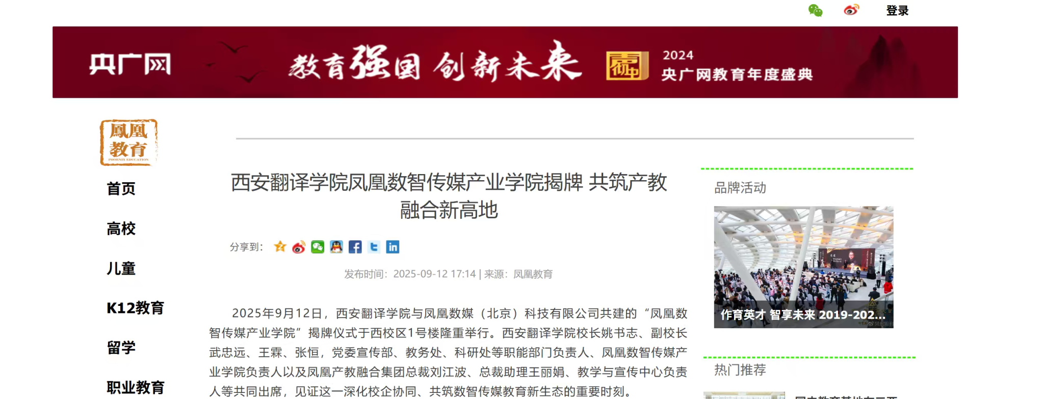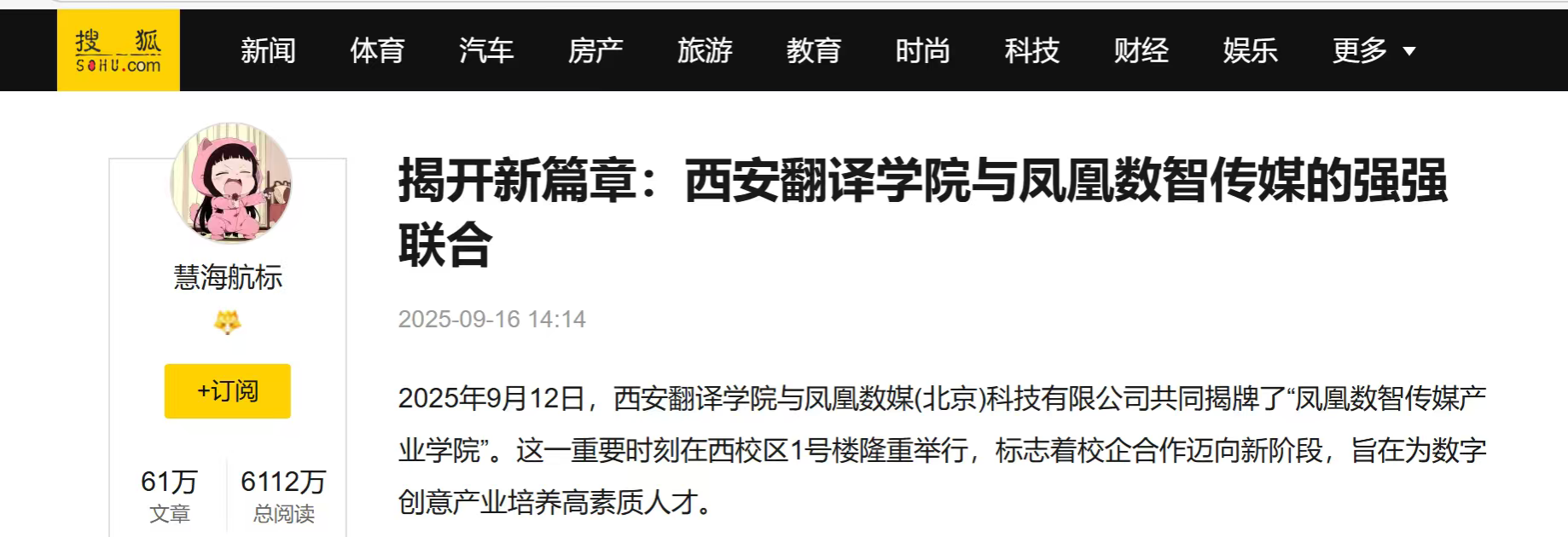 2025年9月12日,西安翻译学院与凤凰数媒(北京)科技有限公司共建的“凤凰数智传媒产业学院”,在西安翻译学院西校区1号楼举行揭牌仪式。据悉,凤凰数智传媒产业学院揭牌获人网、凤凰网、教育新闻等多家媒体平台持续关注报道,校企协同育人的创新实践引发行业关注。