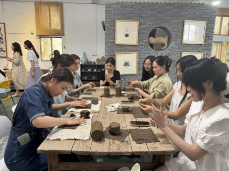 讲座结束后,同学们迎来了最期待的环节——亲手制作陶瓷。指导老师首先示范,双手轻柔地按压陶泥,使其逐渐变成圆润的底座,接着搓出粗细均匀的泥条,层层盘筑于底座之上。短短一分钟,杯子已初具雏形,娴熟流畅的操作引得同学们阵阵喝彩。