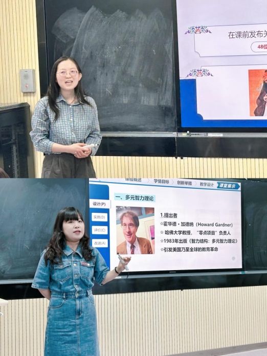 教师教育课程课堂教学创新赛道,张潇文老师讲授的《小学道德与法治课程与教学论》打破传统理论教学模式,以“实践体验”为核心,将课程与教学实践活动紧密结合;邓晨老师的《普通心理学》以情境化教学的方式,实现多元智能理论从抽象到具象的转化。