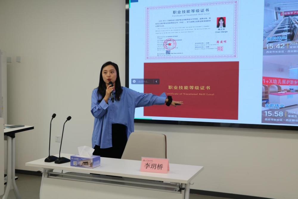 李玥桥老师从行业背景、方向内容、学校支持三个维度展开宣讲。她指出,当前国家高度重视婴幼儿照护服务体系建设,相关政策接连出台,这将为学生带来广阔的就业空间。同时,她介绍了学校的资源保障情况,婴幼儿实训模拟室以及高仿真婴儿高度还原真实场景,帮助学生积累实践经验;1+X婴幼儿照护等级证书培训,有效增强学生的职业竞争力;参与“一带一路”金砖大赛等国际赛事,为学生搭建国际交流平台,拓宽视野并提升专业能力。
