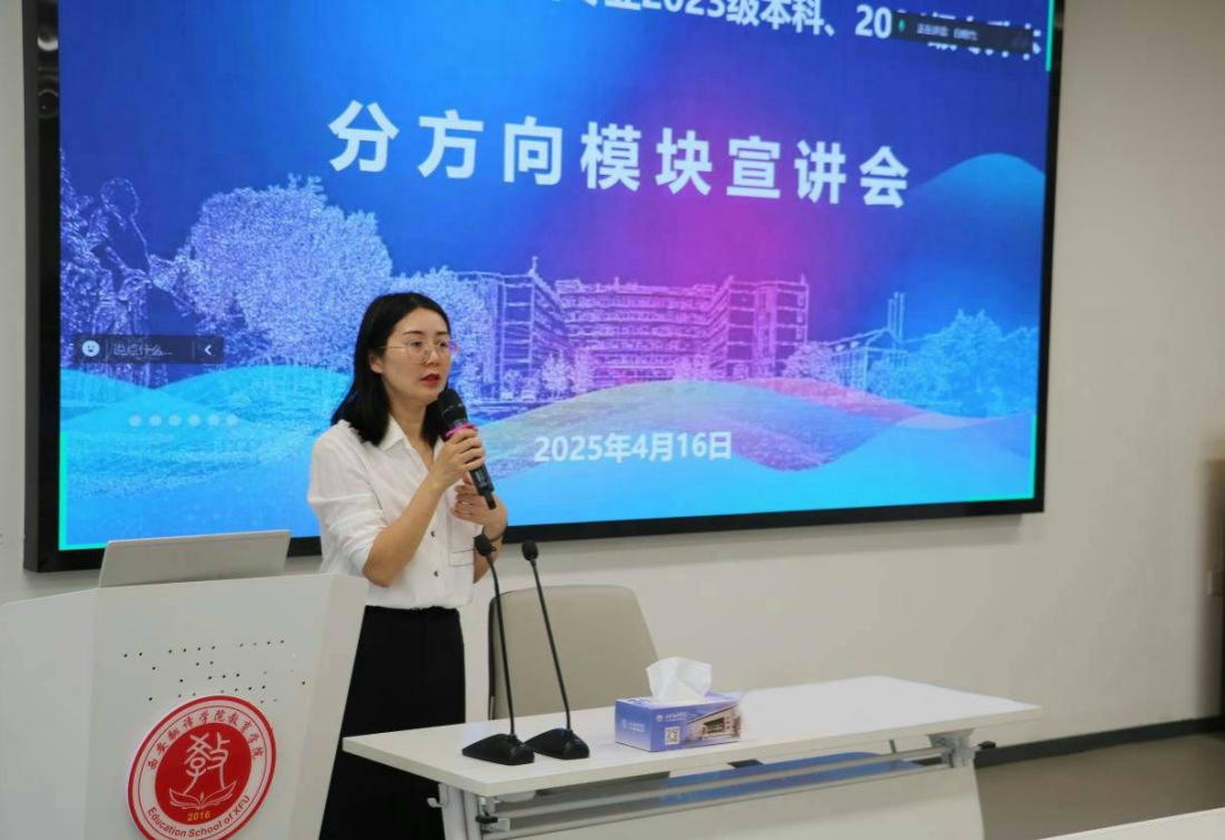 为协助学前教育专业的学生深入了解专业发展路径,确立未来职业生涯规划,2025年4月16日中午学前教育系在8号楼学术报告厅成功召开了2023级本科、2024级专升本学前教育专业分方向宣讲会。会议由学前教育系教师白晓竹主持,学前教育系主任黄玉芳、专职教师王静、辅导员闫玉虎和马玥璐等出席,学前教育专业2023级本科、2024级专升本全体学生线下、线上同步参会。此次宣讲会围绕幼儿体能、婴幼儿照护和幼儿艺术三大模块展开,特邀体育学院专职教师刘彦琴、教育学院美育教学中心教师胡媛媛以及学前教育系专职教师李玥桥,为同学们进行深入细致的解读。