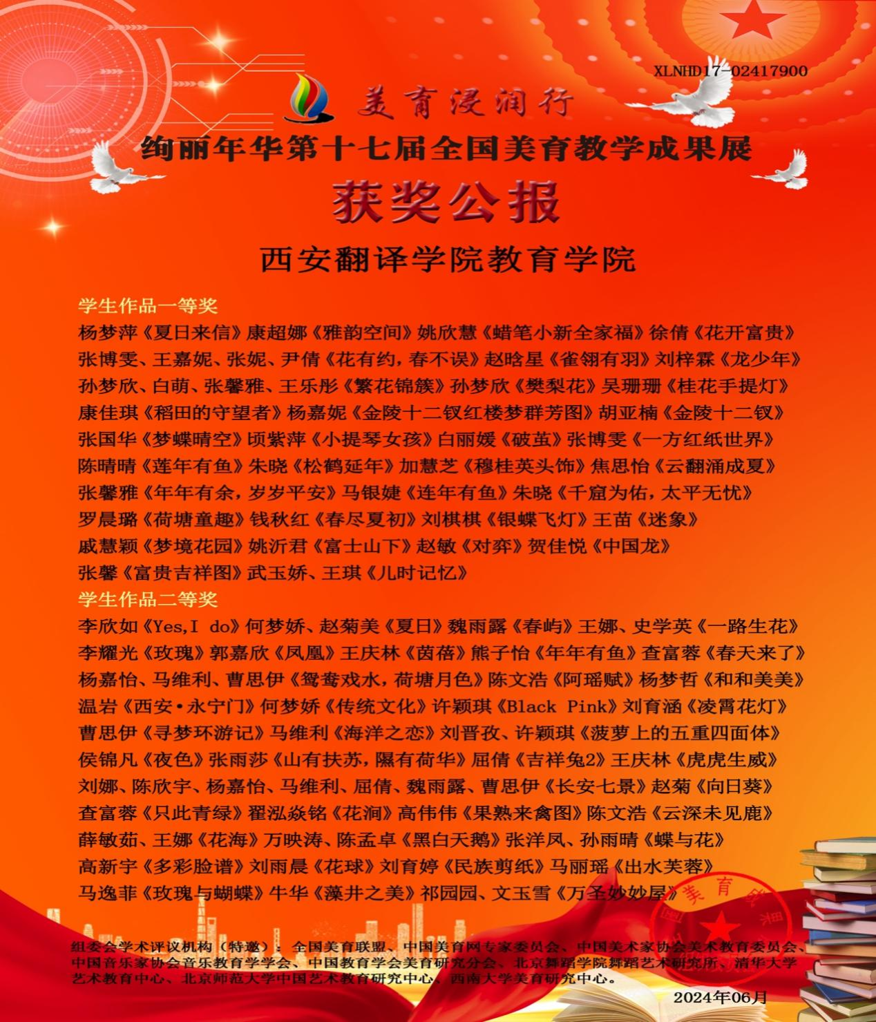 为认真贯彻中办、国办《关于全面加强和改进新时代学校美育工作的意见》、教育部《关于切实加强新时代高等学校美育工作的意见》和《教育部关于全面实施学校美育浸润行动的通知》,强调美育是传承中华文明的重要方式,做实美育具有陶冶情操、温润心灵、激发创新创造活力的价值,把美育纳入高等学校人才培养全过程贯穿在人才培养的全部过程。西安翻译学院教育学院美育教学中心特组织师生参加“美育浸润行—绚丽年华”第十七届全国高校美育教学成果展并取得了骄人的成绩。