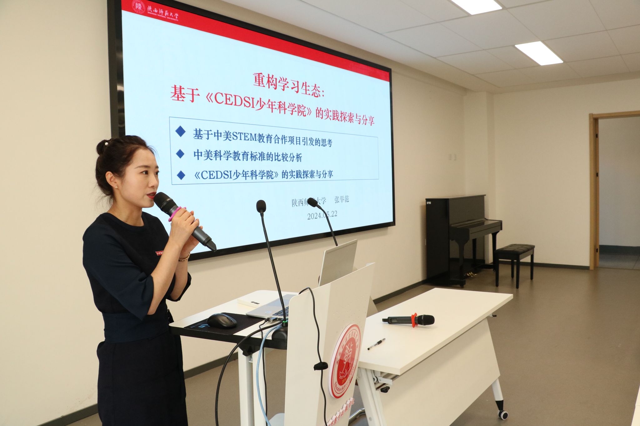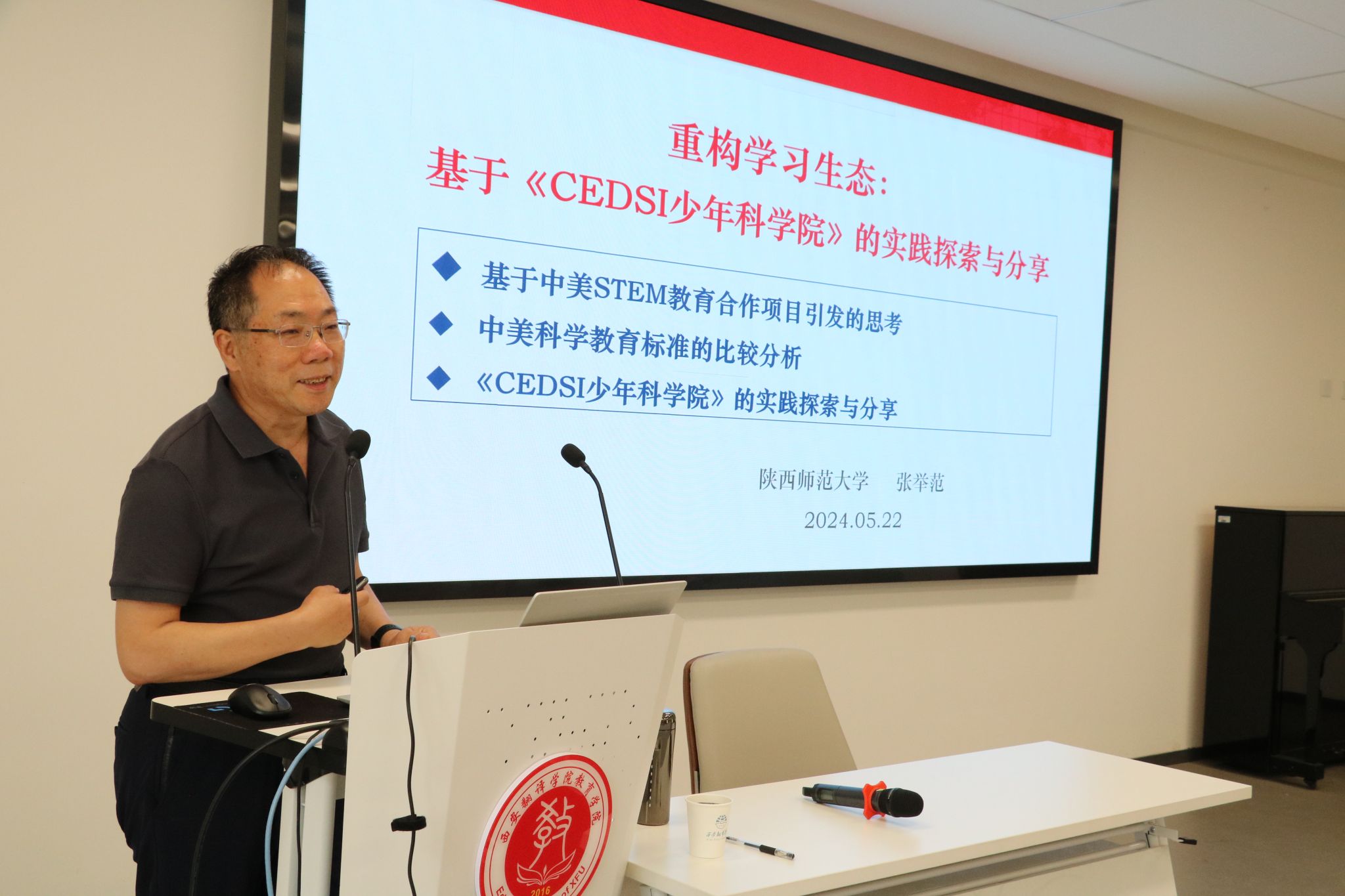 张教授以他近十年实践探索的《CEDSI少年科学院》为讲座内容主体,从三个部分展开了本次讲座:一是基于中美STEM教育合作项目引发的思考;二是中美科学教育标准的比较分析;三是《CEDSI少年科学院》的实践探索与分享。