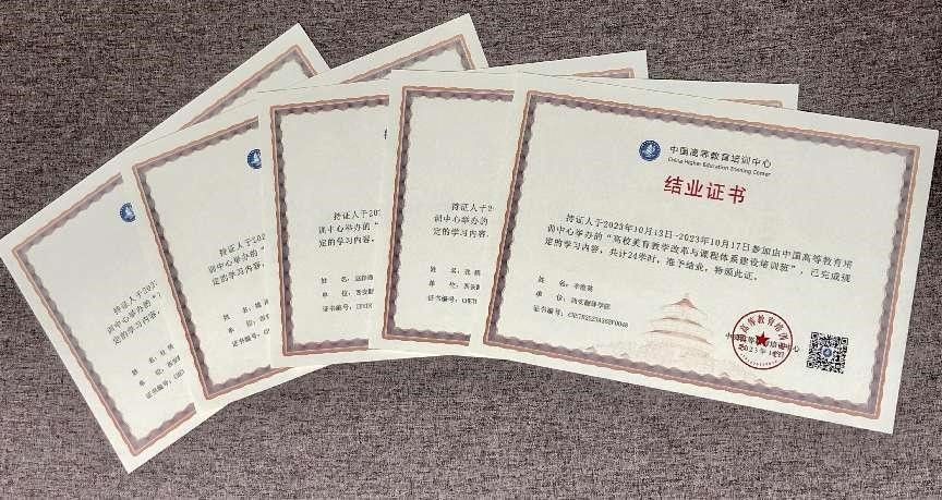 为进一步贯彻落实教育部关于切实加强新时代高等学校美育工作的意见,深化高等学校美育教育教学改革,加强高等学校公共艺术课程建设,推进学校美育改革发展,强化高校美育综合育人功能,发挥美育协同机制的引领与示范作用, 西安翻译学院美育教学中心派教育学院相关负责人与中青年骨干教师辛维英、张鹤、姚涛、杜贇、赵梓涵五位老师于10月13至10月16日在陕西西安参加了中国高等教育培训中心举办的“2023年高校美育教学改革与课程体系建设培训班。经过三天的高强度学习,老师们圆满完成了学习任务并顺利获得培训证书。