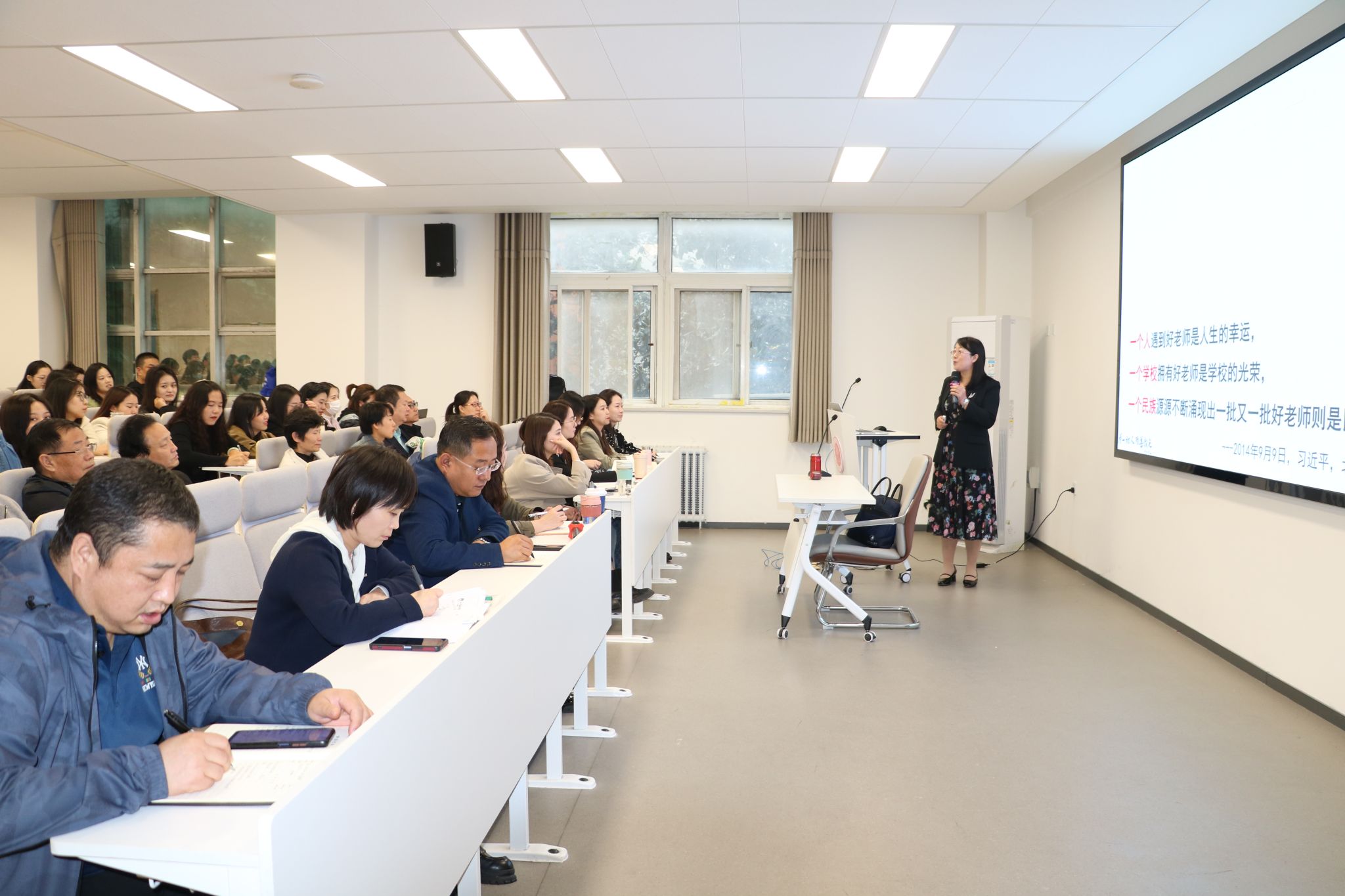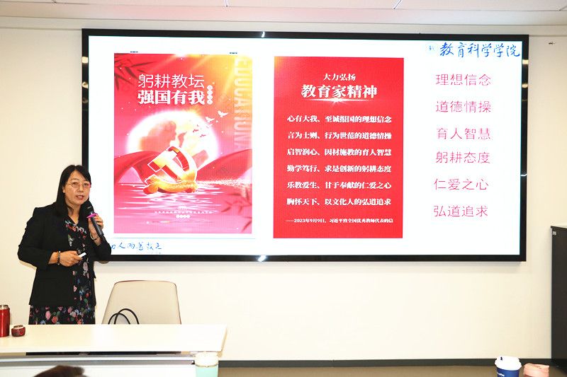 吕银芳教授讲述了《高等学校课程思政建设指导纲要》的重要性。她表示,教师务必要把四个相统一、四个引路人、四有好老师牢记于心,将这些思政元素融入到课堂教学中。她结合推进习近平新时代中国特色社会主义思想进教材进课堂进头脑、培育和践行社会主义核心价值观、加强中华优秀传统文化教育、深入开展宪法法治教育、深化职业理想和职业道德教育等五个方面,分享了课程思政建设的目标要求和内容重点,并建议所有教师结合专业特点推进课程思政建设,根据人才培养目标和毕业要求制定相应的课程教学目标,并从中深入挖掘思政育人目标,将课程思政融入课堂教学建设全过程。随后,她结合教学案例,分享了课程思政教学的实践感悟。她强调,教师要牢记育人使命,不断积累思政育人元素,以教育家精神为奋斗目标,用心做好四有好老师,努力践行四个引路人,用心用情做好学生为学、为事、为人的大先生。
