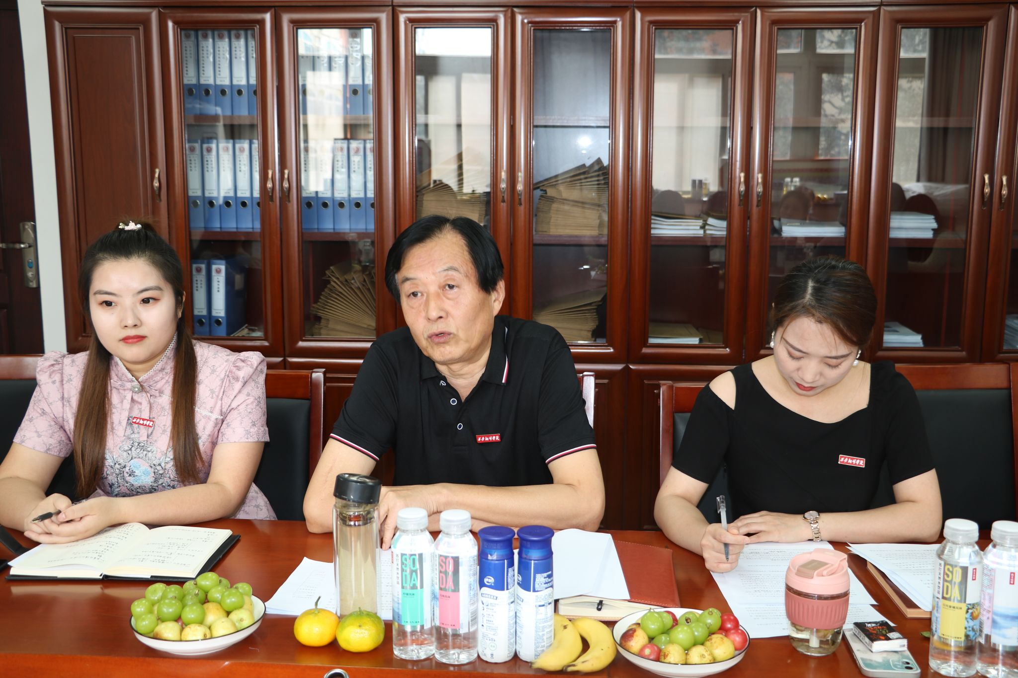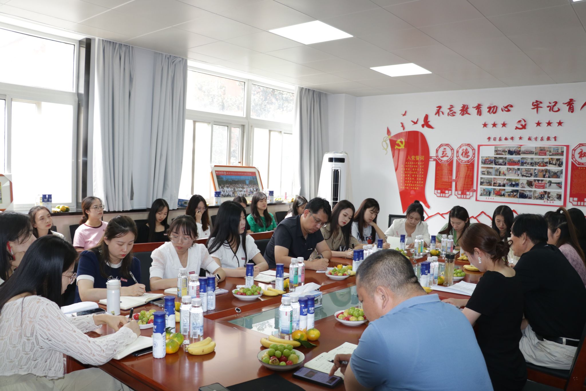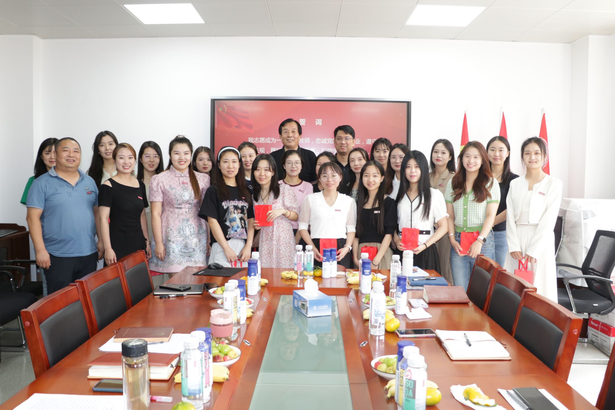 何兆华院长、庞小佳、辛维英副院长为新入职教师们颁发了教育学院纪念章,全体教师合影留念,座谈会在活跃的氛围中结束。