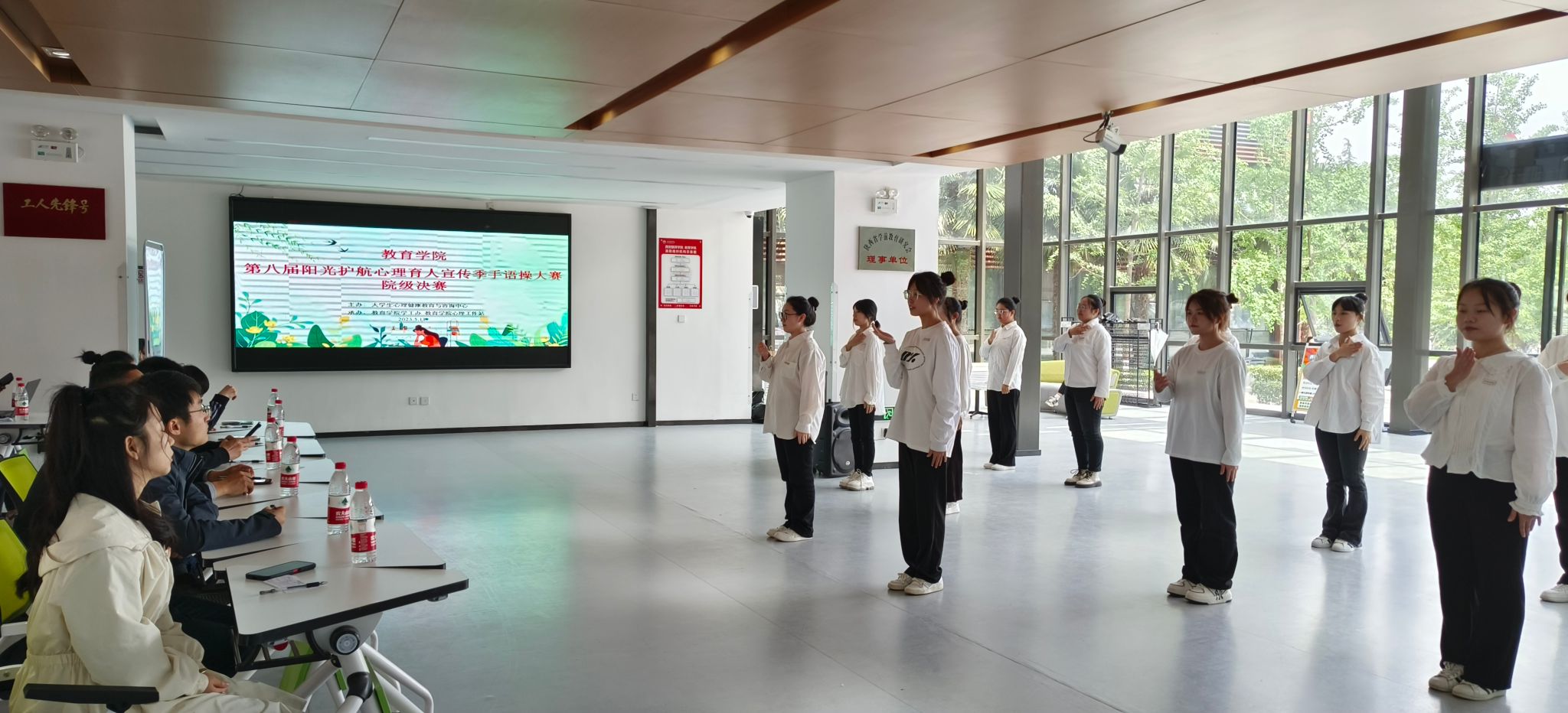 5月11日中午,教育学院第八届阳光护航心理育人宣传季“展示灵动的生命,沐浴爱的阳光”——手语操大赛院级决赛在东区8号楼大厅圆满举办。本次教育学院手语操大赛院级决赛由教育学院学工办、教育学院心理工作站承办,获胜队伍将参加西安翻译学院手语操大赛全院总决赛。出席本次手语操大赛院级决赛主要领导有教育学院学工办主任冯祎洁、学工部大学生心理健康教育与咨询中心谢晓欣老师、教育学院各党支部书记。