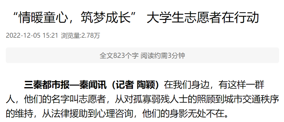 据悉,系列志愿服务活动获得了今日头条、西部新闻网、三秦都市报—秦闻讯、搜影中国等多家媒体报道,截至目前三秦都市报-秦闻讯总浏览量达到2.8w+。