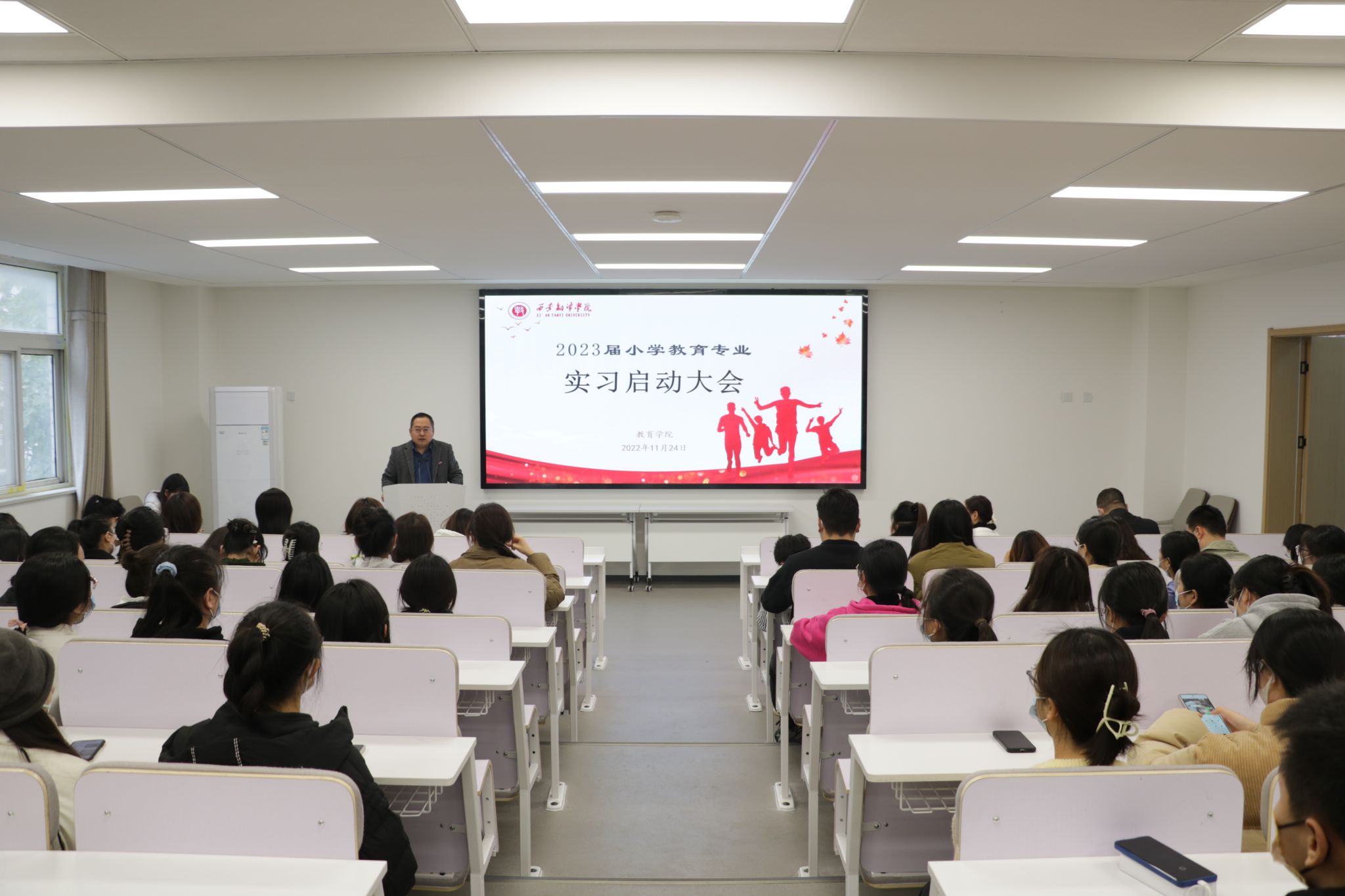为进一步推动毕业生实习工作顺利进行,引导学生将教育教学理论与实践紧密结合,2022年11月24日,教育学院召开2023届小学教育专业毕业生实习启动会。教育学院副院长王小龙、庞小佳、辛维英,教务办主任赵海波、副主任张改宁、小学教育系主任阎涛及小学教育系全体教师、辅导员和毕业生参加此次会议。会议由小学教育系邓晨老师主持。