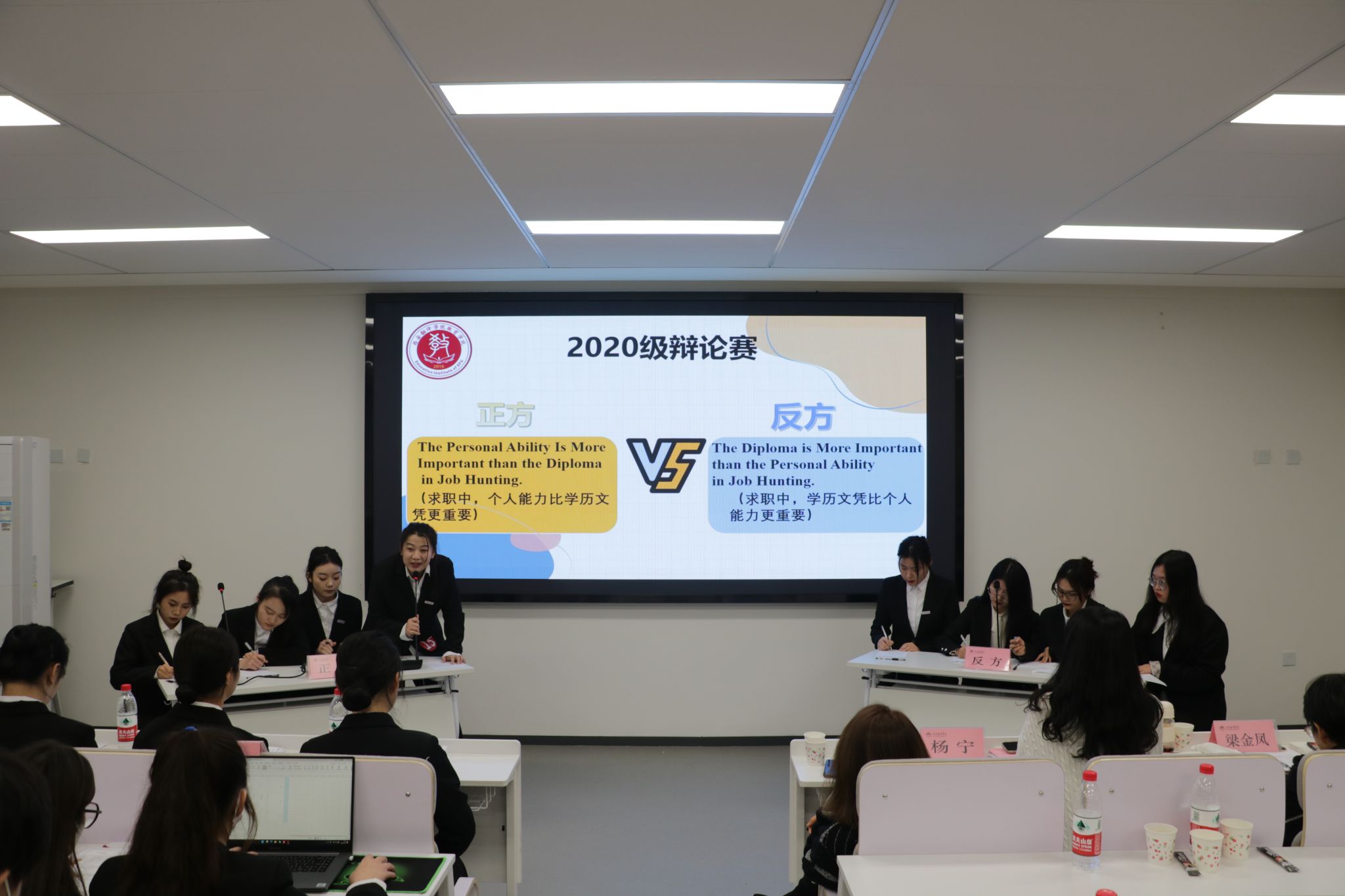 本次口语大赛共分为三个部分:演讲赛、辩论赛及朗读者。演讲分为命题演讲、即兴演讲(大三)和才艺展示三个环节;英文朗读分为诗歌朗诵和英语谚语口译两个环节;辩论分为陈述观点、自由辩论和总结陈词三个环节;所有选手的精彩表现及才艺展示赢得了在场老师和同学的阵阵掌声,尤其是辩论赛的辩手们反应机敏,语言流畅,为我们展现了精彩绝伦的口语应变能力。