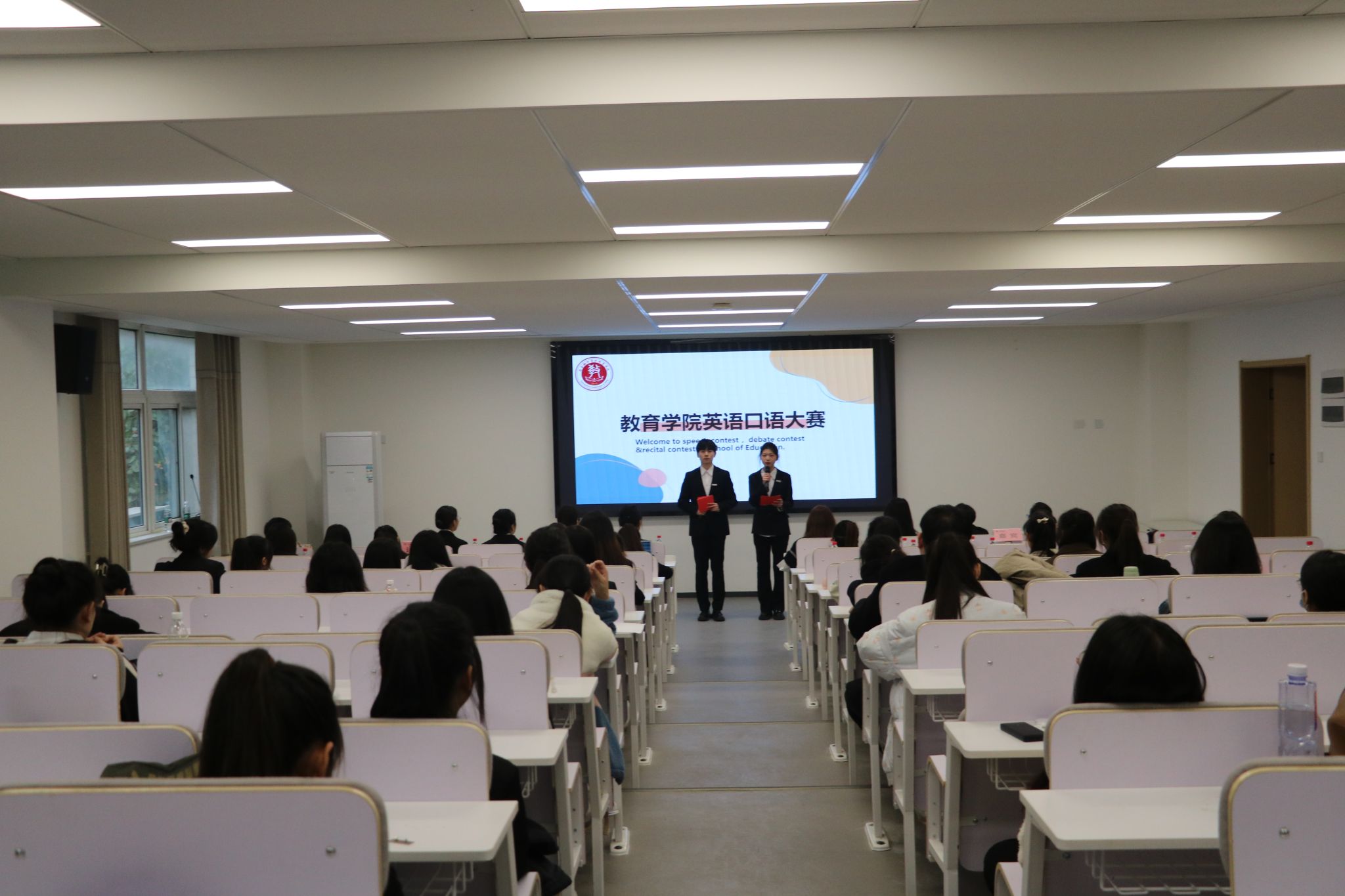 为提高广大学生的英语口语表达能力,激发同学们学习英语的热情,丰富大家的学习生活,西安翻译学院第三十四届外语口语大赛教育学院复赛于 2022年11月9日下午14:00在八号楼二楼学术报告厅顺利举行,莅临本次比赛的领导及嘉宾有教育学院副院长王小龙、辛维英,教育学院综合班主任赵海波、综合办副主任张改宁,担任本次口语大赛的评委有教育学院专职教师杨宁、英文学院专职教师张雪、郭冬会、李洁莹、梁金凤。
