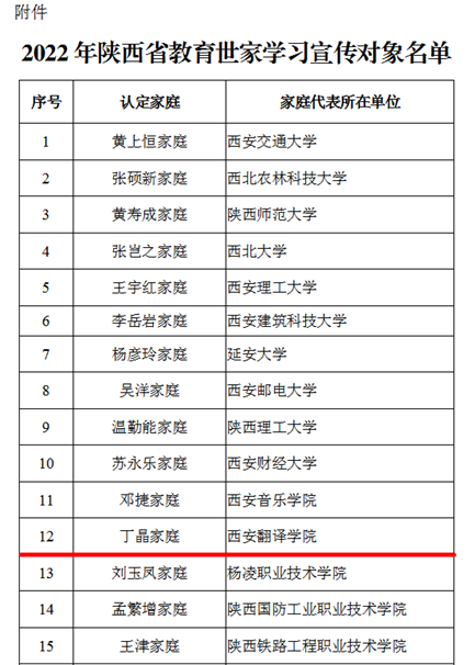 在第38个教师节来临之际,陕西省教育厅公布了2022年度“教育世家”评选结果,西安翻译学院理事长丁晶家庭光荣上榜。