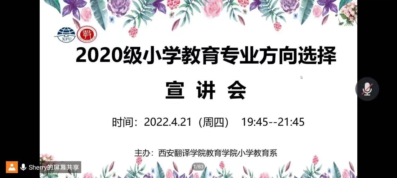 2022年4月21日晚19:50——21:00,小学教育系通过腾讯会议组织召开2020级小学教育专业模块方向宣讲会。教育学院副院长窦强、小学教育系主任庞小佳及全系教师、2020级小学教育专业本科全体学生参加会议。