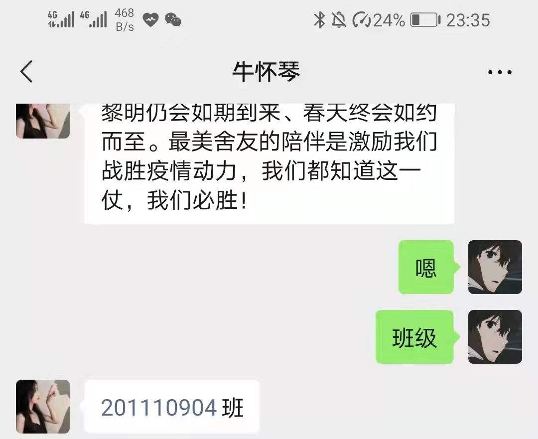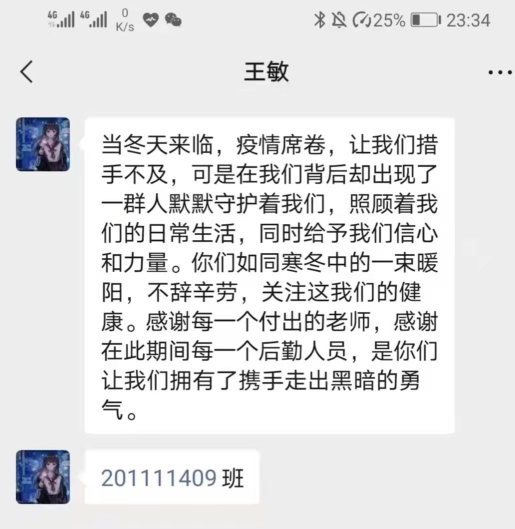 王海荣同学感谢在此次疫情时所有的校领导,正是因为你们正确的决策,才有了我们现在更安全的生活及学习环境,也正因为你们有序的管理才有了我们安全的保障,你们就像黎明前的曙光照亮着大家,让我们更加安心。