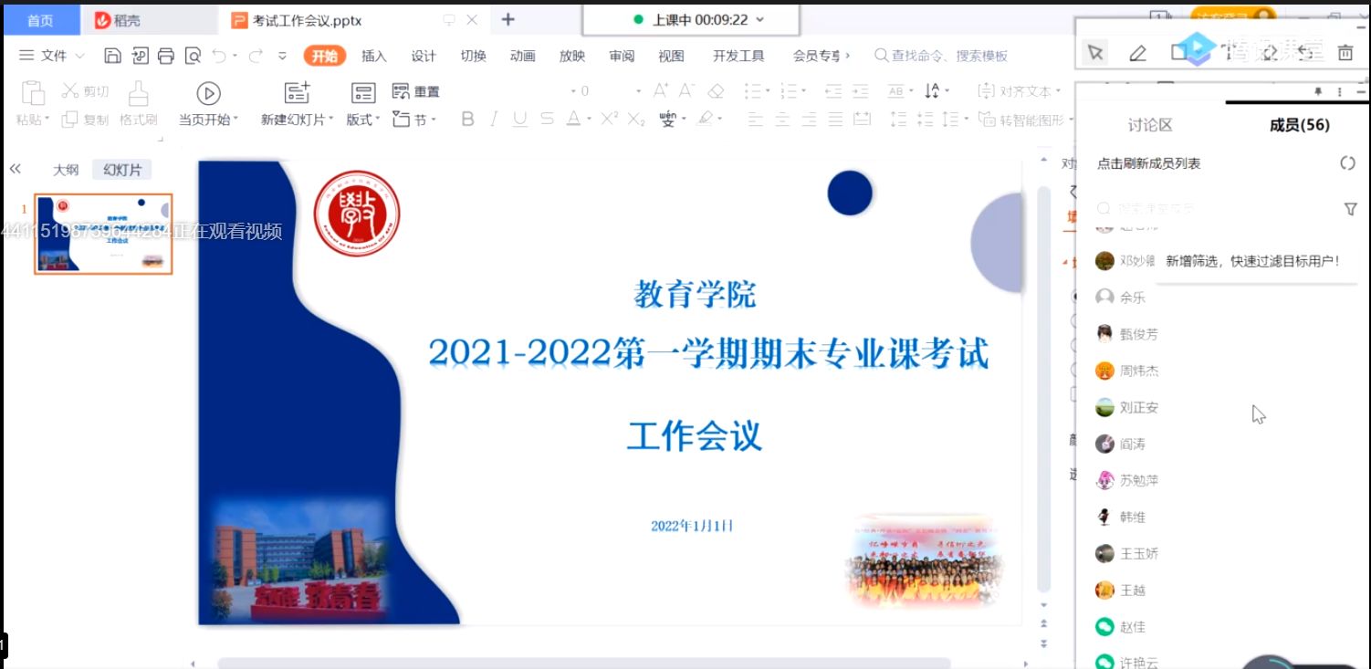 2022年元月1日20:00,教育学院利用腾讯课堂召开期末专业课线上考试工作会,教育学院院长张建昌、副院长窦强、王小龙、邵攀科以及全体监考老师、命题老师、全体辅导员参加,会议由窦强副院长主持。
