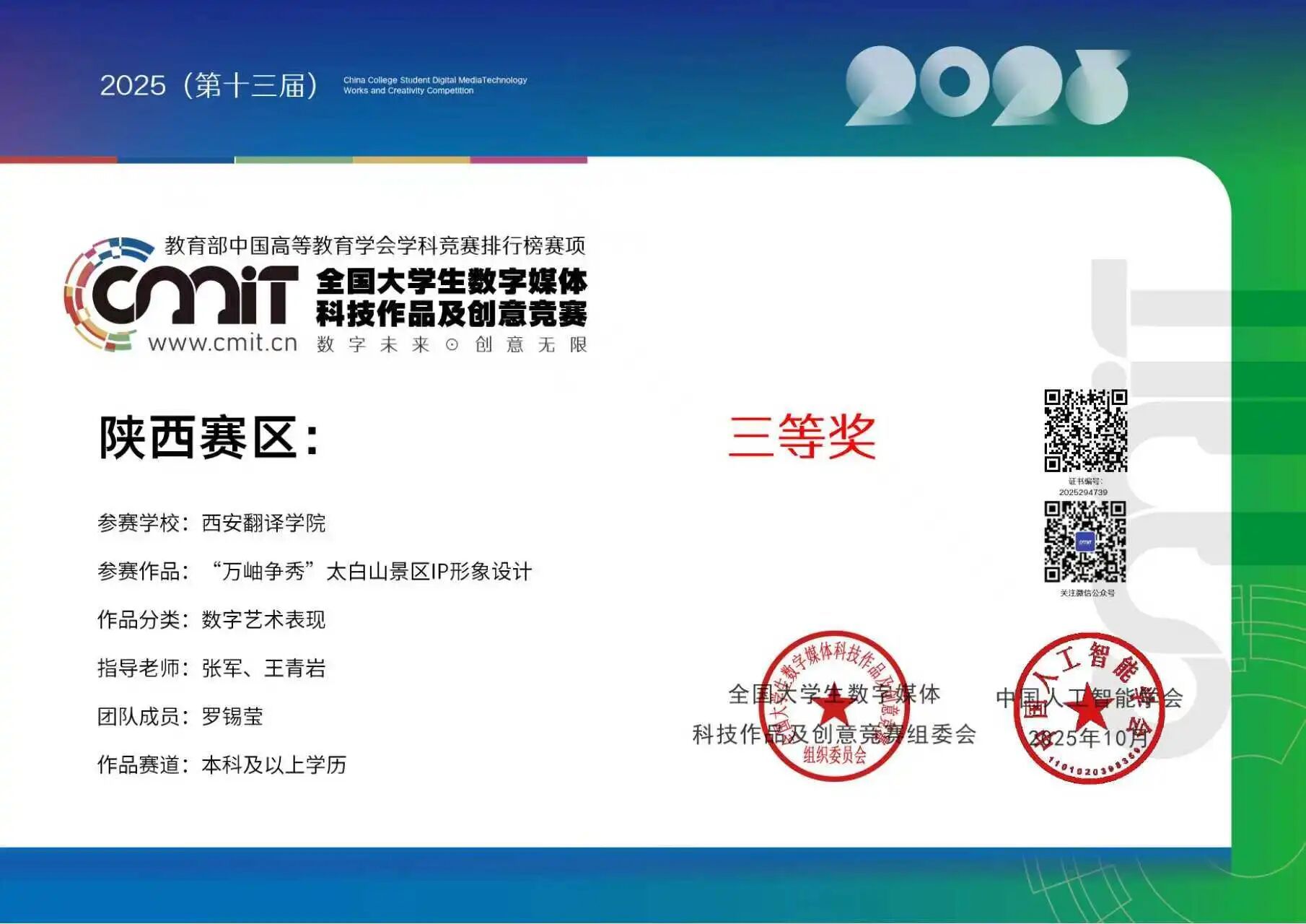 近日,2025年全国大学生数字媒体科技作品及创意竞赛获奖名单正式公布。艺术与设计学院、凤凰数智传媒产业学院学子再传捷报,凭借出色的创新与实践能力,共荣获国家级三等奖1项,二等奖1项、三等奖4项,总计6项大奖,成绩斐然。