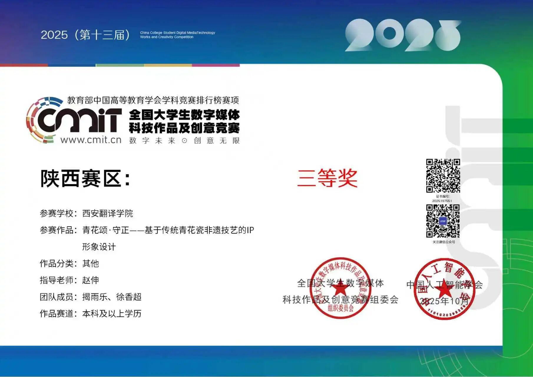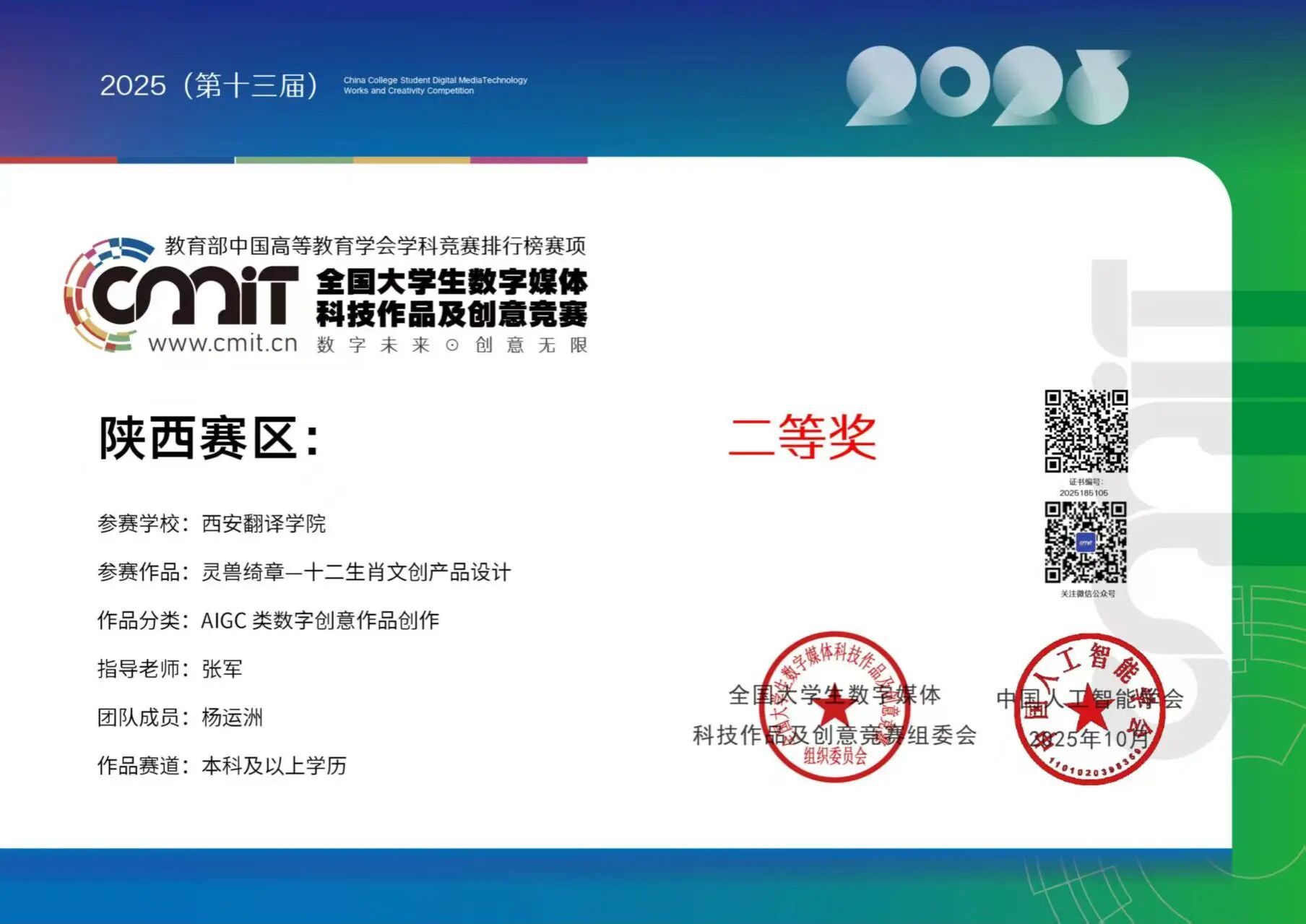 其中,由艺术与设计学院张军教师指导产品设计专业学生完成的《灵兽绮章-十二生肖文创产品设计》作品,以其独特的创意和扎实的技术应用,在众多参赛作品中脱颖而出,成功斩获全国总决赛三等奖,充分展现了我校学子的数字媒体创作水平。