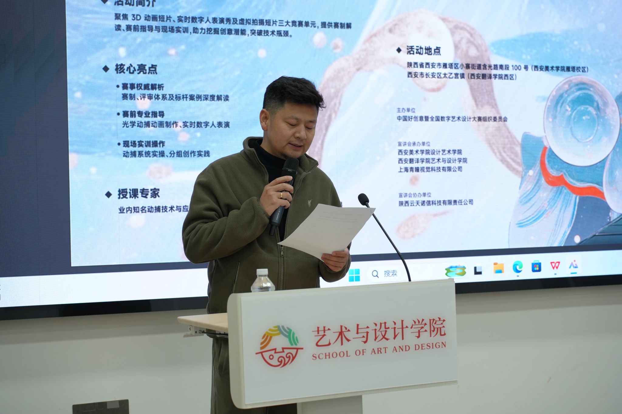 主讲人姜中泽通过主题演讲、赛事流程、赛前指导、作品展演、现场实训等多元化形式,展现以社会责任为宗旨,数字艺术为核心的大赛精神,运用动捕技术的魅力,为青年学子开启了一场探索数字艺术前沿的思维盛宴。从“基于光学动捕的数字人流程创作”角度出发,结合各自实践经验,为现场观众提供了宝贵的行业洞察和发展建议。