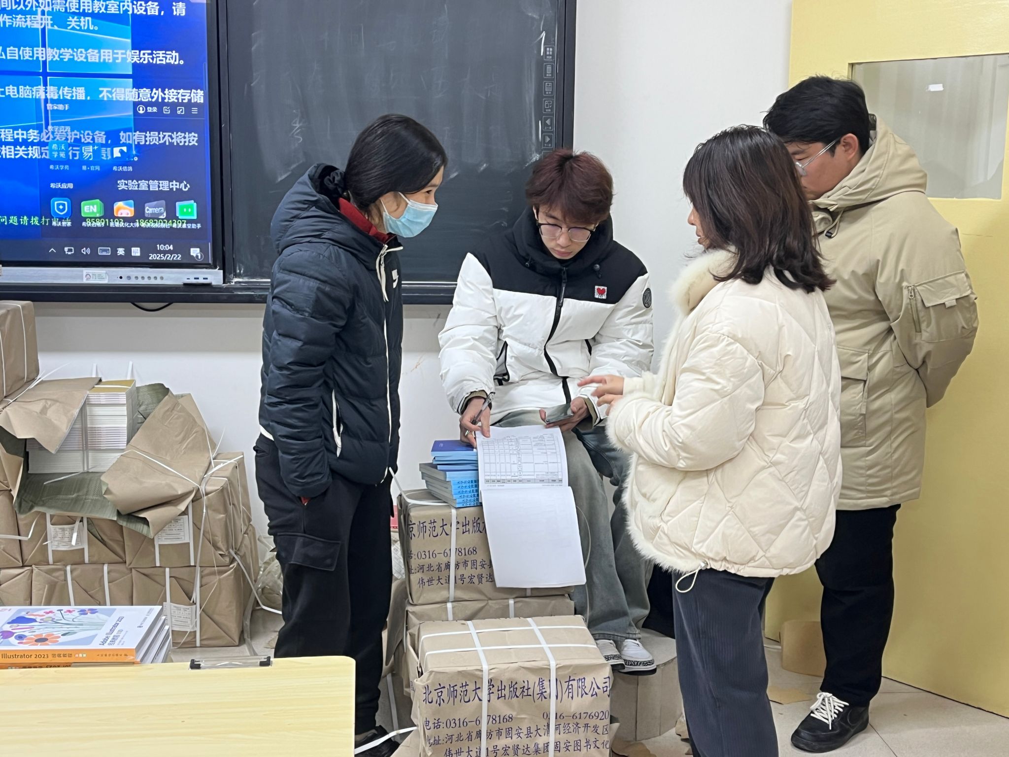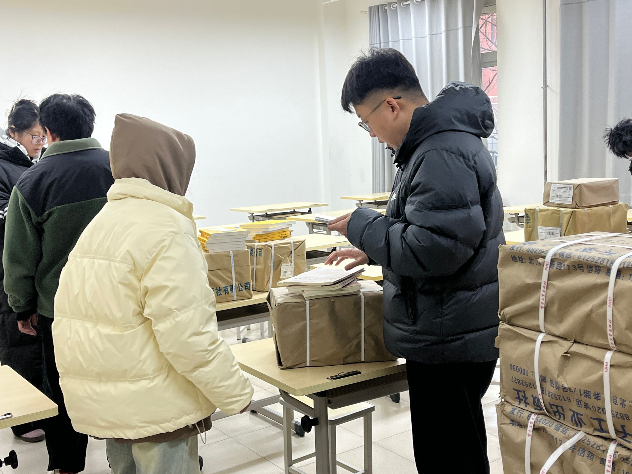 2月22日,各位辅导员组织学生有序领取教材,确保教材分发准确无误,为开学第一课做好充分准备。同学们抱着崭新的教材,脸上洋溢着对新知识的渴望和期待,这些教材将成为他们新学期在知识海洋中遨游的“得力助手”。