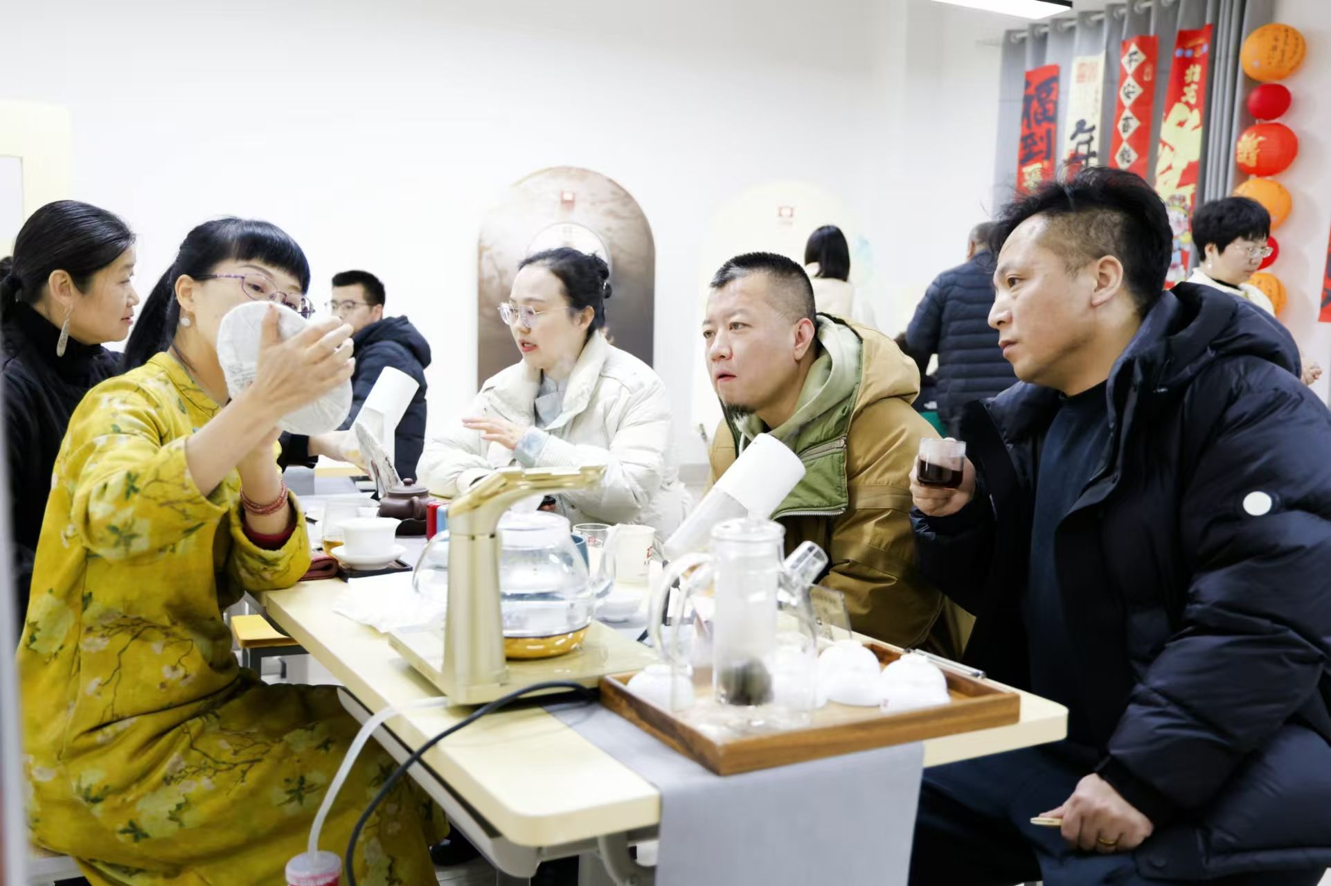 讲课完成后,老师们在茶艺师指引下,来到茶艺集市,品普洱老茶、喝新式普洱调饮茶、尝中式茶果子、敲空灵鼓、围炉煮茶,老师们亲身参与、亲自体验中国优秀的传统文化,大家一起围席而坐,在轻松愉快的氛围中,共赴这场冬日茶会,他们专注倾听,细心品味,茶香仿佛带着传统文化的精髓,缓缓沁入每一位老师的心田。不少老师表示:“中国茶文化博大精深,是珍贵的文化遗产。我们通过这次活动,学习到了‘茶和天下’的理念,体验了‘清静和雅’的精神。”