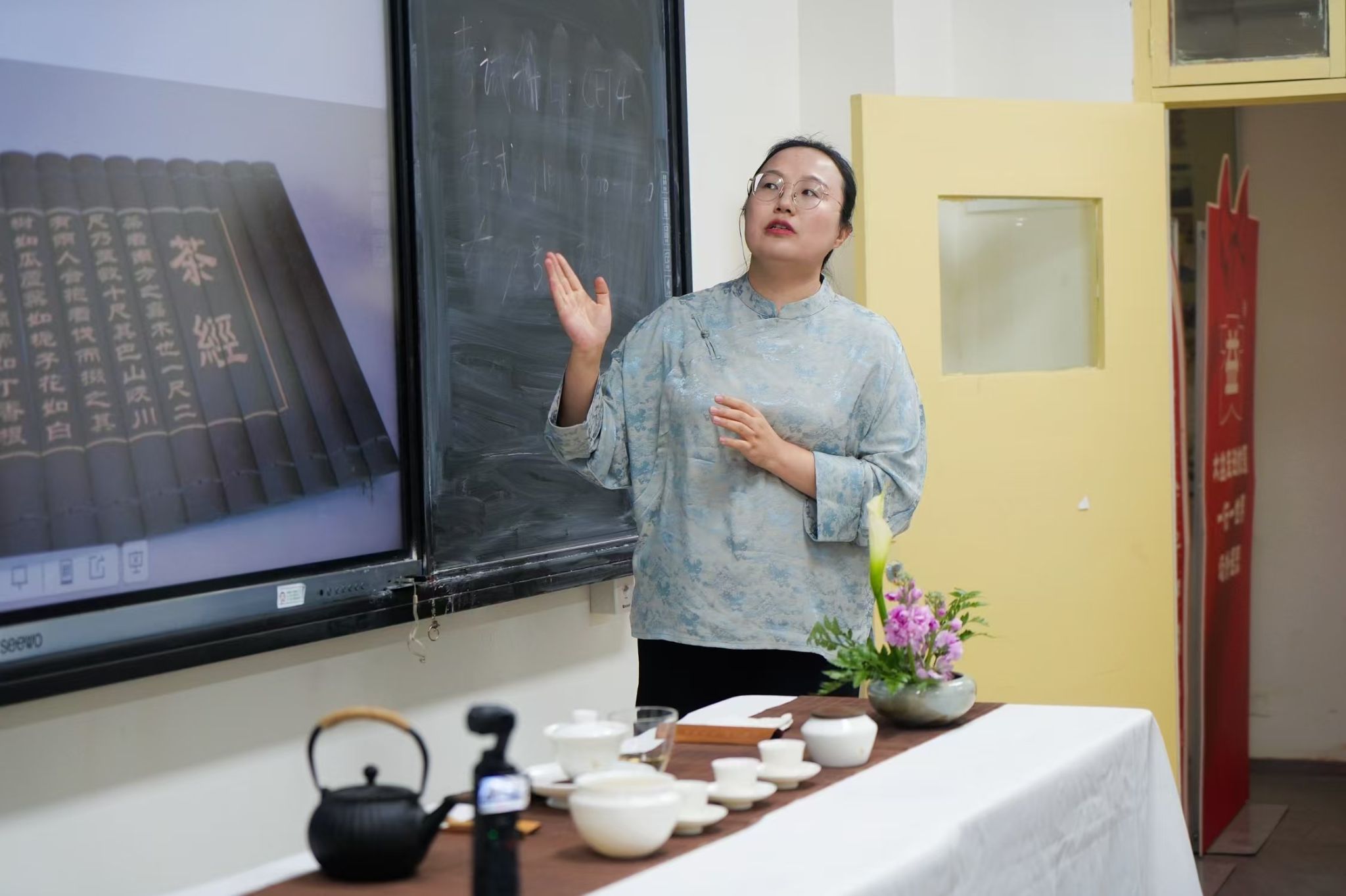 课堂上,韩老师从茶的起源、历史发展、种类、产地分布等多个角度系统地介绍了中国茶文化,并深入浅出地讲解了茶品鉴和茶桌礼仪,包括摆盏净杯、泡茶、品茶、奉茶等具体步骤。通过生动的讲解和互动,老师们不仅了解到“三才盖碗”所蕴含的人与天地和谐共处的哲理,还亲身感受到每一步骤背后深邃的文化内涵和中华礼仪之美。