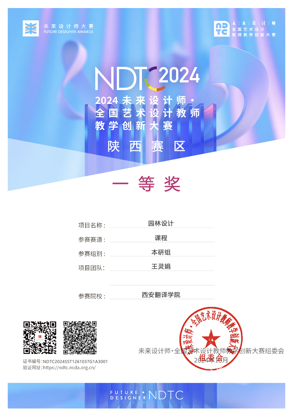 而在所有参赛作品中,王灵娟老师的《园林设计》课程凭借其出色的教学设计和自然的思政融入,王灵娟老师荣获陕西赛区一等奖,并代表西安翻译学院艺术与设计学院赴现场参加了全国决赛。