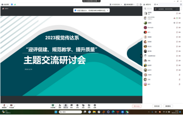11月24日,根据艺术与设计学院院务会迎评工作会议要求,为进一步规范教学,提升教学质量,结合审核评估工作,视觉传达系线上开展了“迎评促建、规范教学、提升质量”主题交流研讨会,从我系教师教学态度、教学成果、“传帮带”情况等方面展开探讨交流,旨在提升我系教师对教育教学工作的重视,在工作中取长补短,树立自信心。视觉传达系主任陈智明、视觉传达设计专业负责人樊海燕教授、陆宝新教授及全系教师参加,会议由李宝楠主持。