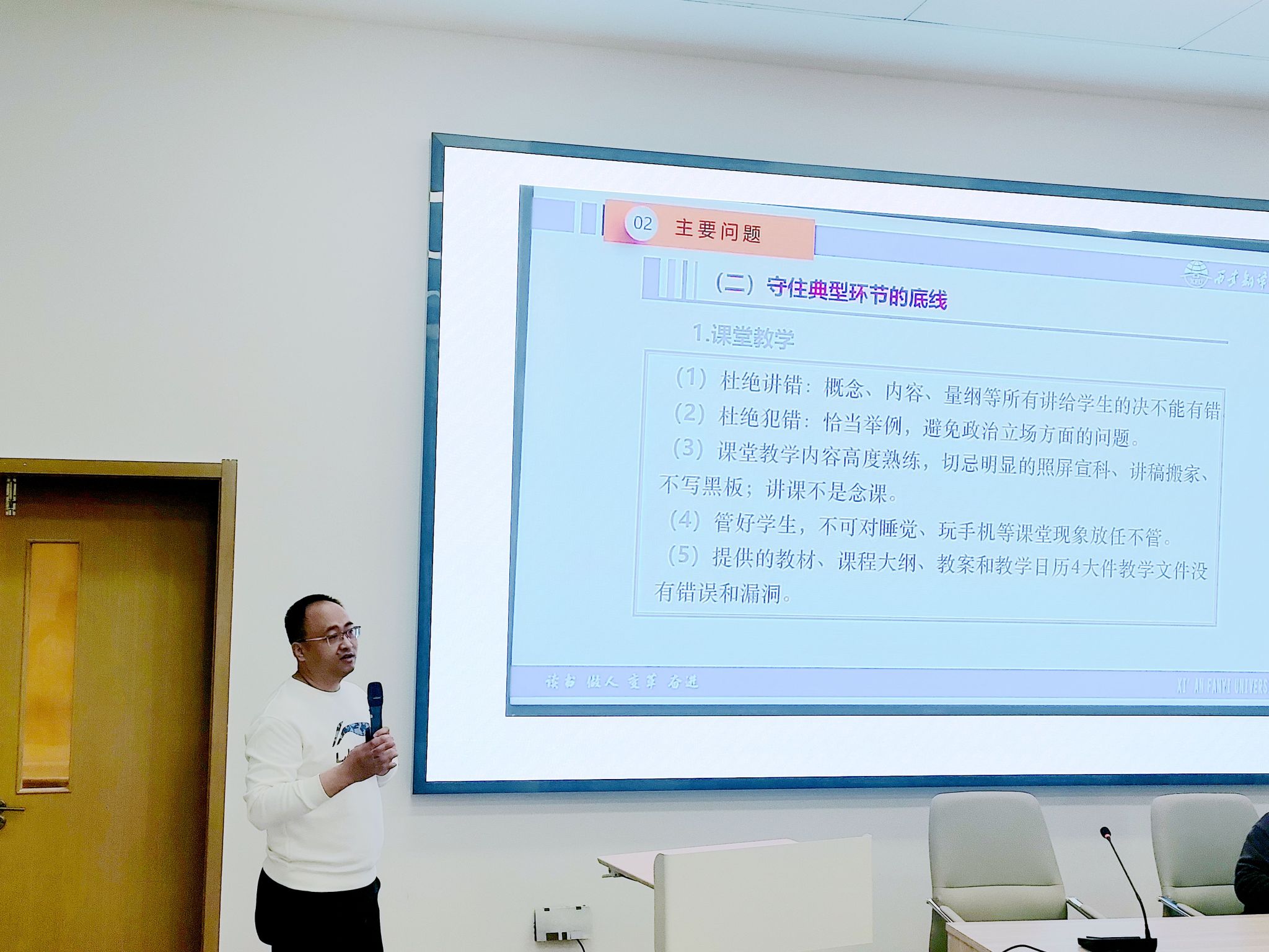 会议开始,吴迪对学校召开的本科教育教学审核评估迎评动员会的会议精神进行传达,对于迎评工作中的细节问题进行强调,就专家入校时间节点进行了通报,对近期教师上课、教学设备调试、评估材料完善、教学环境建设等重点工作进行了再安排再布置,要求全体教职工在迎评的紧要关头全面做好冲刺准备,确保科学、高效的完成迎评各项工作。