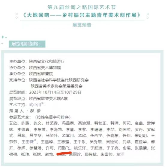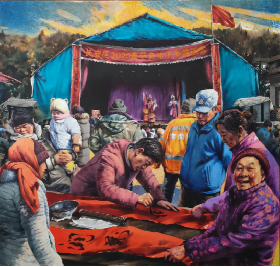 近日由陕西省文化和旅游厅主办,陕西省美术博物馆协办,陕西省雕塑院承办的第九届丝绸之路国际艺术节《大地回响——乡村振兴主题青年美术创作展》,于10月14日至10月29日在陕西省雕塑美术馆A馆展出,艺术与设计学院教师闫鹏飞作品《文化下乡之腊月阳光》入选本次展览。