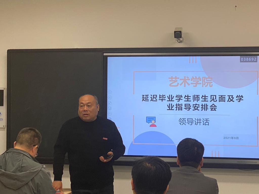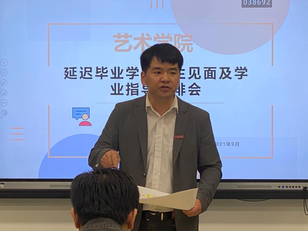 为了促进延迟毕业学生顺利完成学业,2021年9月27日,艺术学院举行延迟毕业学生师生见面及学业指导安排会,出席本次会议的有艺术学院院长董千,教学副院长左明刚,科研副院长马平,综合办主任邵伟娣,学工干事张海,综合办教师董小健、李江涛,同时参会的还有涉及课程的指导教师,本次会议由董小健老师主持。