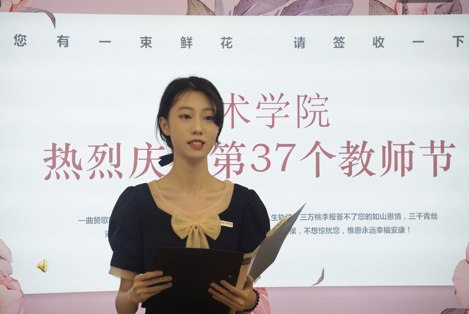 活动进入到了尾声, 20届视觉传达设计系祝欣然同学代表艺术学院全体学生向各位老师送上了最真挚的祝福,不仅如此,艺术学院的学生还自发为老师们制作了祝福视频,并通过投屏向老师们送上了一个十分有创意的教师节礼物。